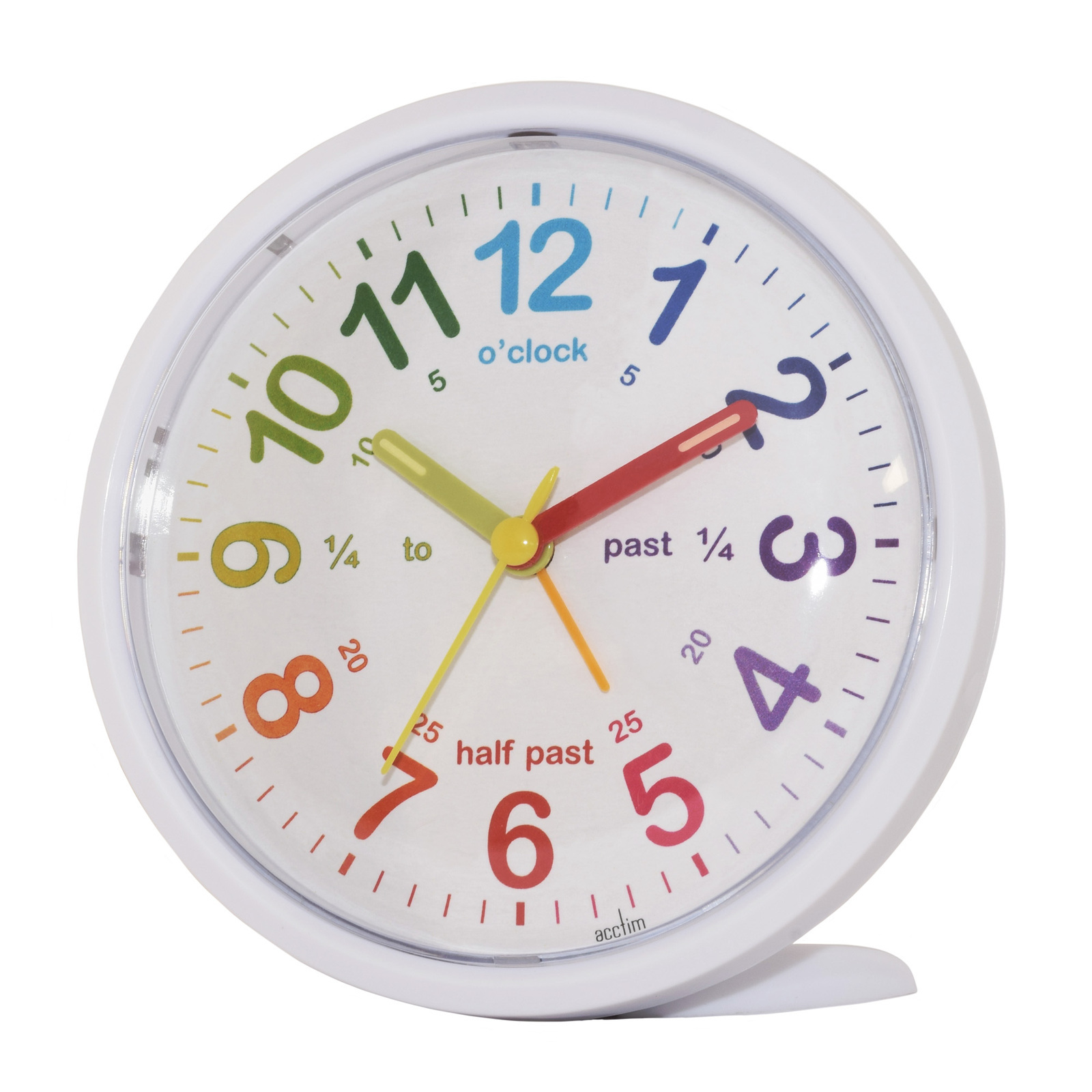 With its bright coloured numbers and hands, this alarm clock by ACCTIM would easily appeal to children. Designed with an educational element in mind, this well designed alarm clock would be well suited to a school setting or a childs bedroom, and would serve as a helpful assistant in teaching children all about the concept of time. Measuring 11cm in height, this clock features bright numerals, in both hourly digits as well as seconds ( every 5 seconds), with the words 'O'Clock', 'Quarter Past', 'Half Past' and 'Quarter To' displayed in the relevant places on the clock to further help children learn all about time. The clock is rounded out by a white case. Rest assured your children will never run late for school again with this handy educational piece well suited to their bedroom.