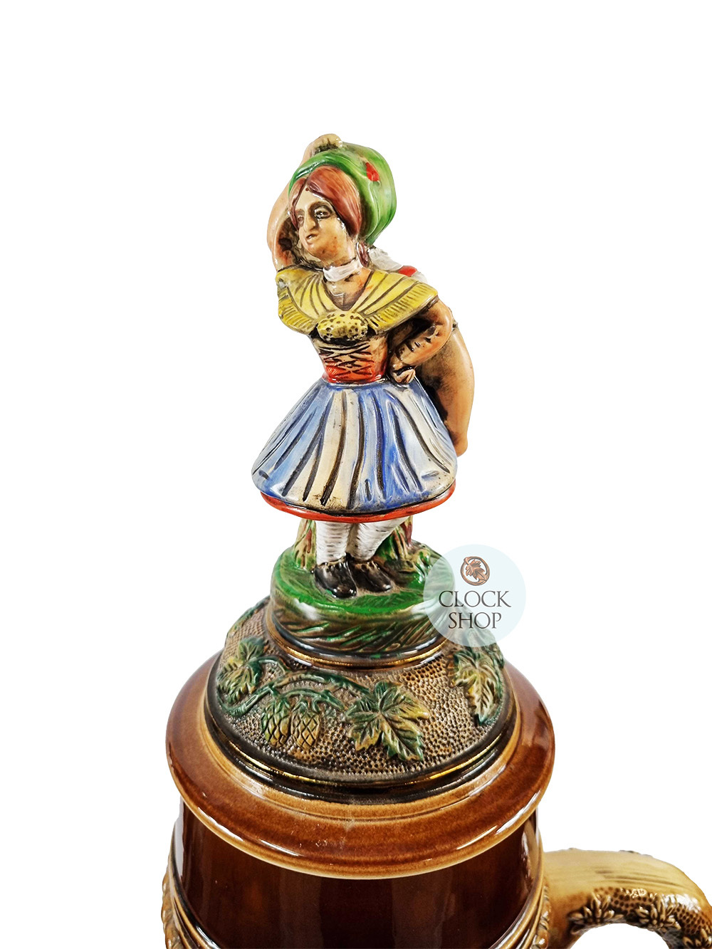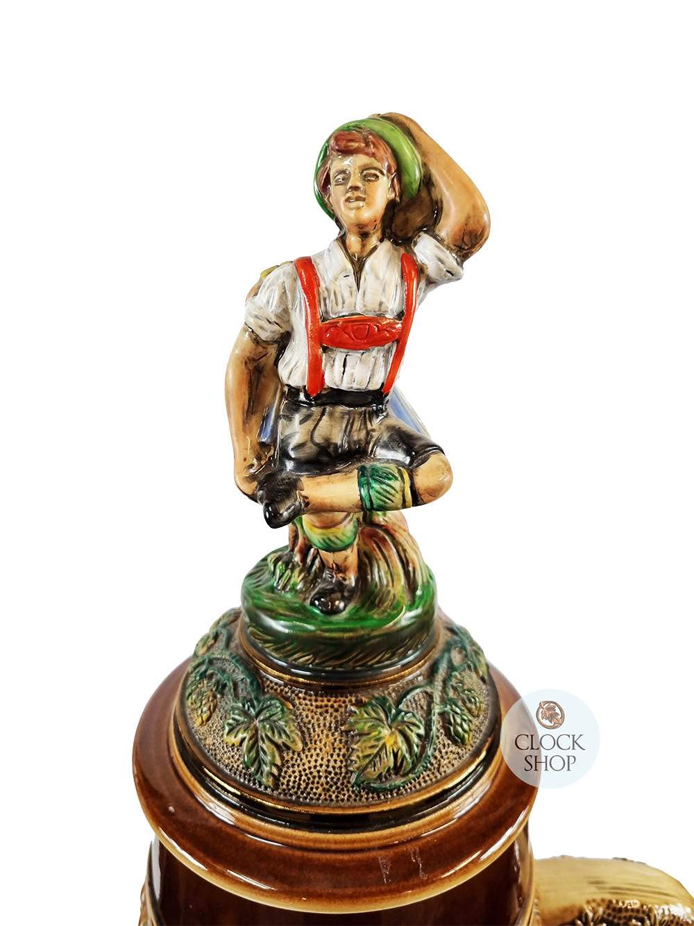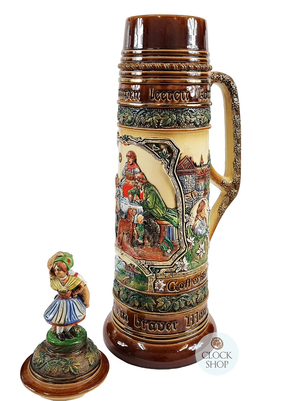 This authentic 12 litre German beer stein was crafted by King-Werks, and was inspired by paintings of the famous Alpine Painter Franz von Defregger, an 18th century Austrian artist known for producing genre art and history paintings set in his native county of Tyrol. The German text on the stein reads: 'Wer diesen Humpen leeren kann, der ist fΓΌrwahr ein braver Mann', which translates to 'The man who can empty this stein is for sure a strong man!'. Smaller German text on the stein reads βHopfen und Malz β Gott erhaltβsβ, which translates to 'Hops and Malt β May God protect'!