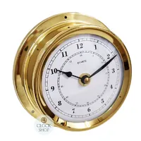 This nautical clock features a white dial with black arabic numerals, protected by an acrylic lens, and a polished brass case. This eye-catching quartz clock houses a highly precise and reliable quartz battery movement for world-class timekeeping accuracy that you come to expect from anything German-made.