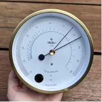 Measuring 133mm in diameter, this hygrometer features a clean white dial with easy to read measuring ranges, protected by a mineral glass lens and a housing made from polished brass. The accuracy of the hygrometer is highlighted with a concise pointer that is bent at the tip, guaranteeing a parallax free and therefore very precise reading of the respective measured value.