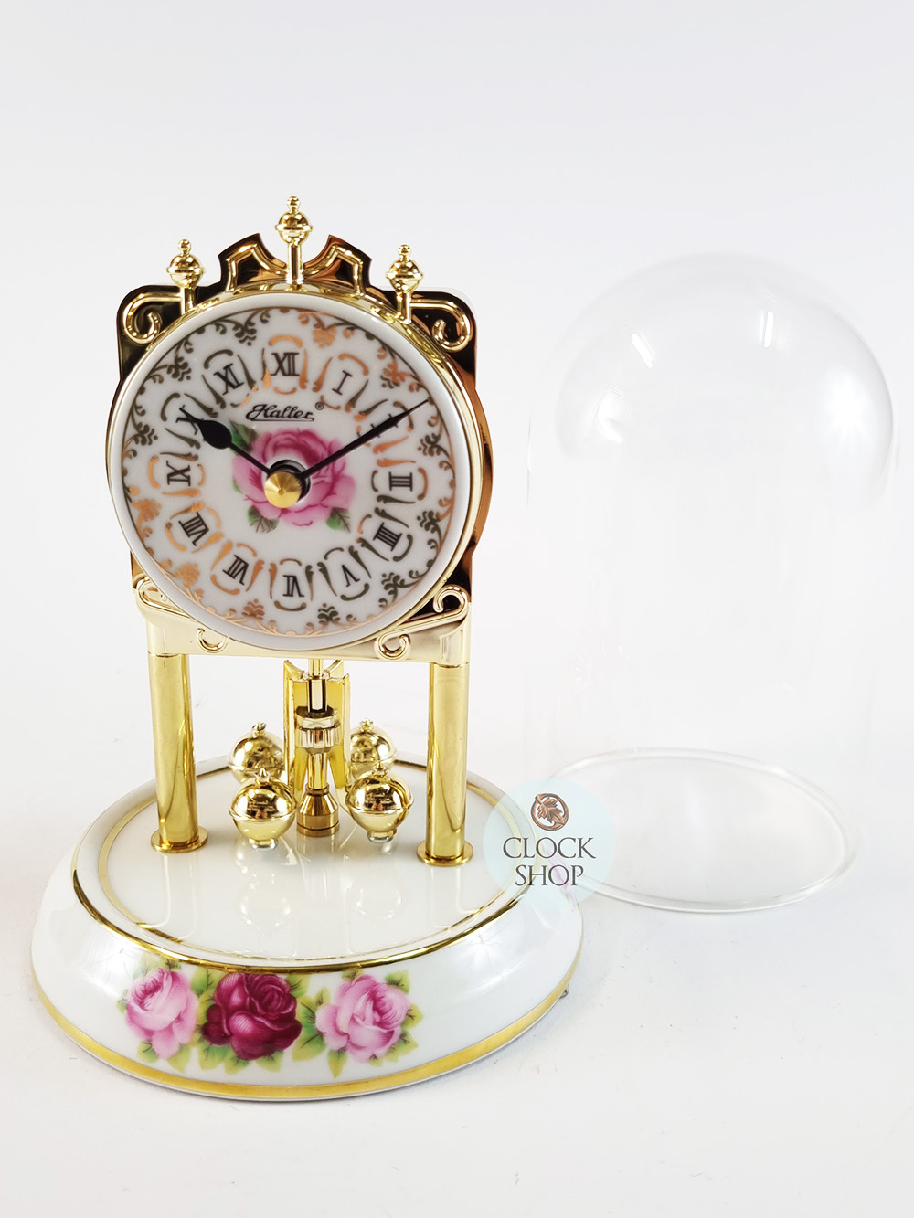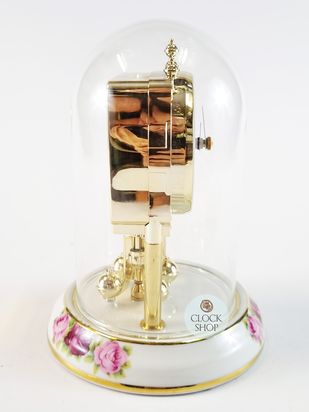 Measuring 16cm in height, this beautiful dome clock features an elegant colour scheme of white and gold with pink roses adorning the timepiece. Made from porcelain, this timepiece features a beautiful white porcelain dial with neat black hands pointing towards roman numerals. Perhaps the most beautiful feature of the entire timepiece is the addition of colourful pink roses, both on the dial as well as on the base of the clock- designed in a baroque-motif style. The base of the clock is made from porcelain, whilst 2 side metal columns and the top crown are coloured in a polished brass tone. In addition, a spinning pendulum twirls back and forth at the base of the clock. The entire timepiece is rounded out by a crystal glass dome that covers the entire timepiece, and is driven by a high quality battery operated quartz movement that is very accurate at time keeping.