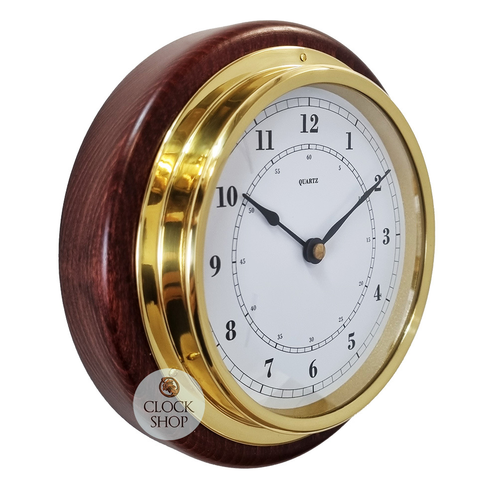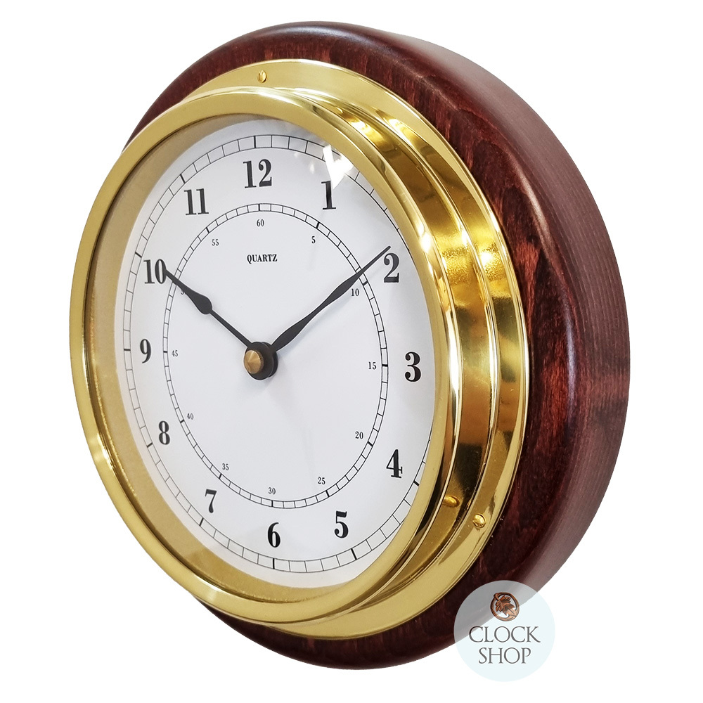 This nautical clock features a clean white dial with easy-to-read Arabic numerals, protected by an acrylic lens, polished brass bezel and timber body that has been finished with a brilliant mahogany stain. This eye-catching quartz clock houses a highly precise and reliable quartz battery movement for world-class timekeeping accuracy that you come to expect from anything German-made.
