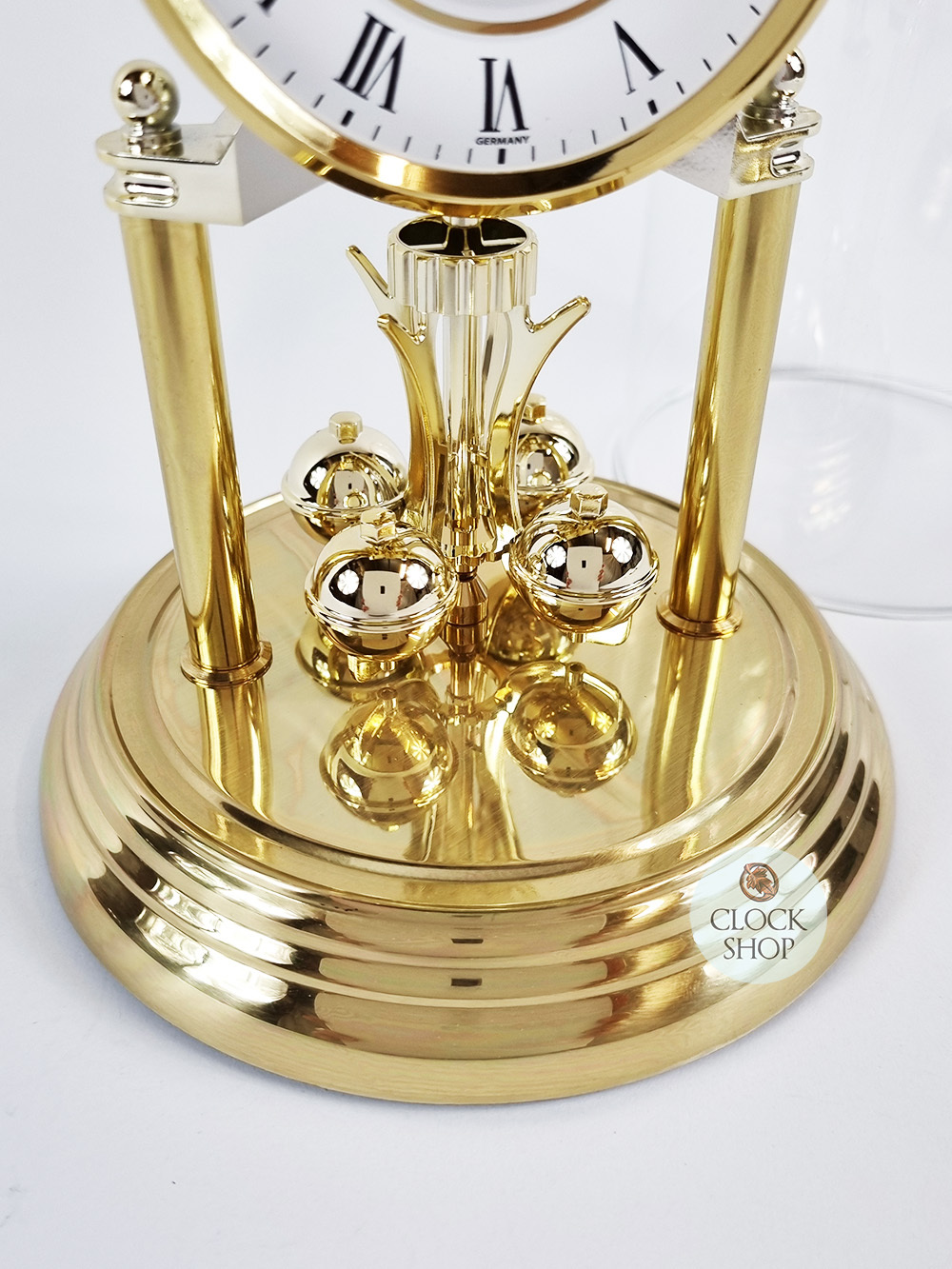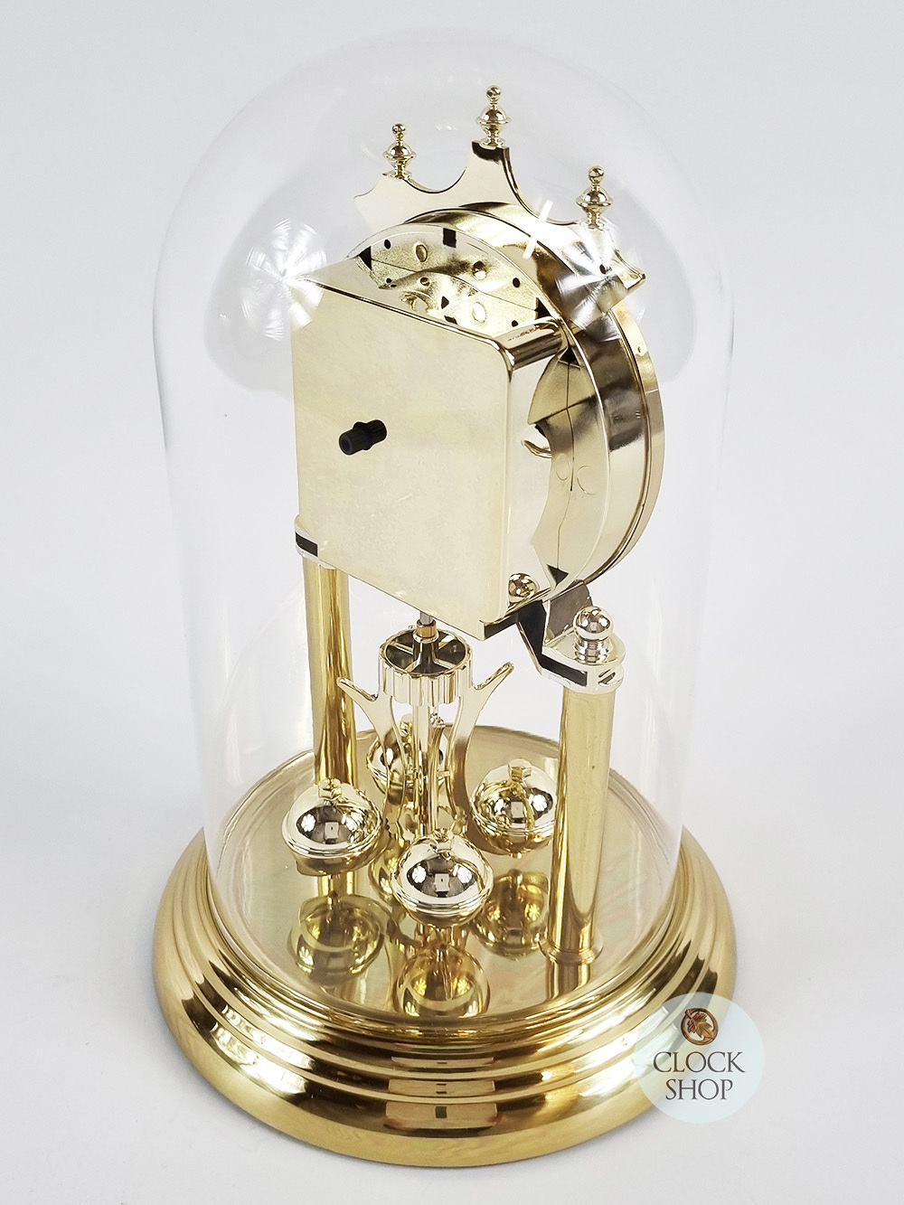 Measuring 23cm in height, this beautiful dome clock features a diamond cut bezel and a diamond cut white dial with metal hands pointing towards neat black roman numerals. Additional features include a brass coloured sheet molded over the plastic base, and polished brass columns with a crown at the top; whilst a spinning brass coloured pendulum twirls back and forth at the base of the clock. The entire timepiece is rounded out by a crystal glass dome that covers the entire timepiece, and is driven by a high quality battery operated quartz movement that is very accurate at time keeping.