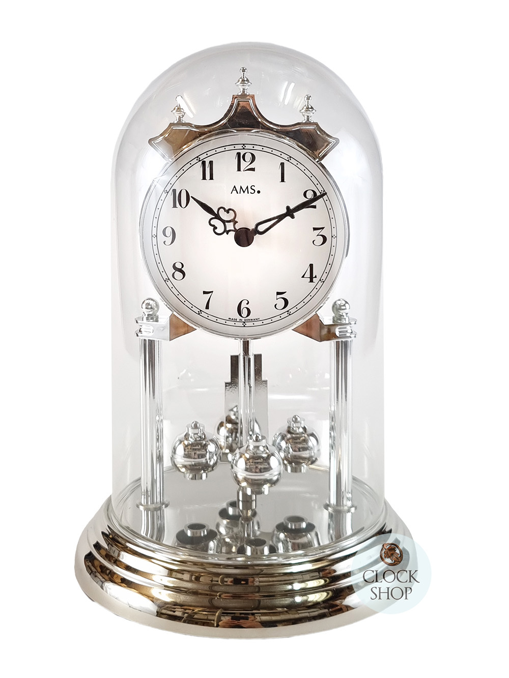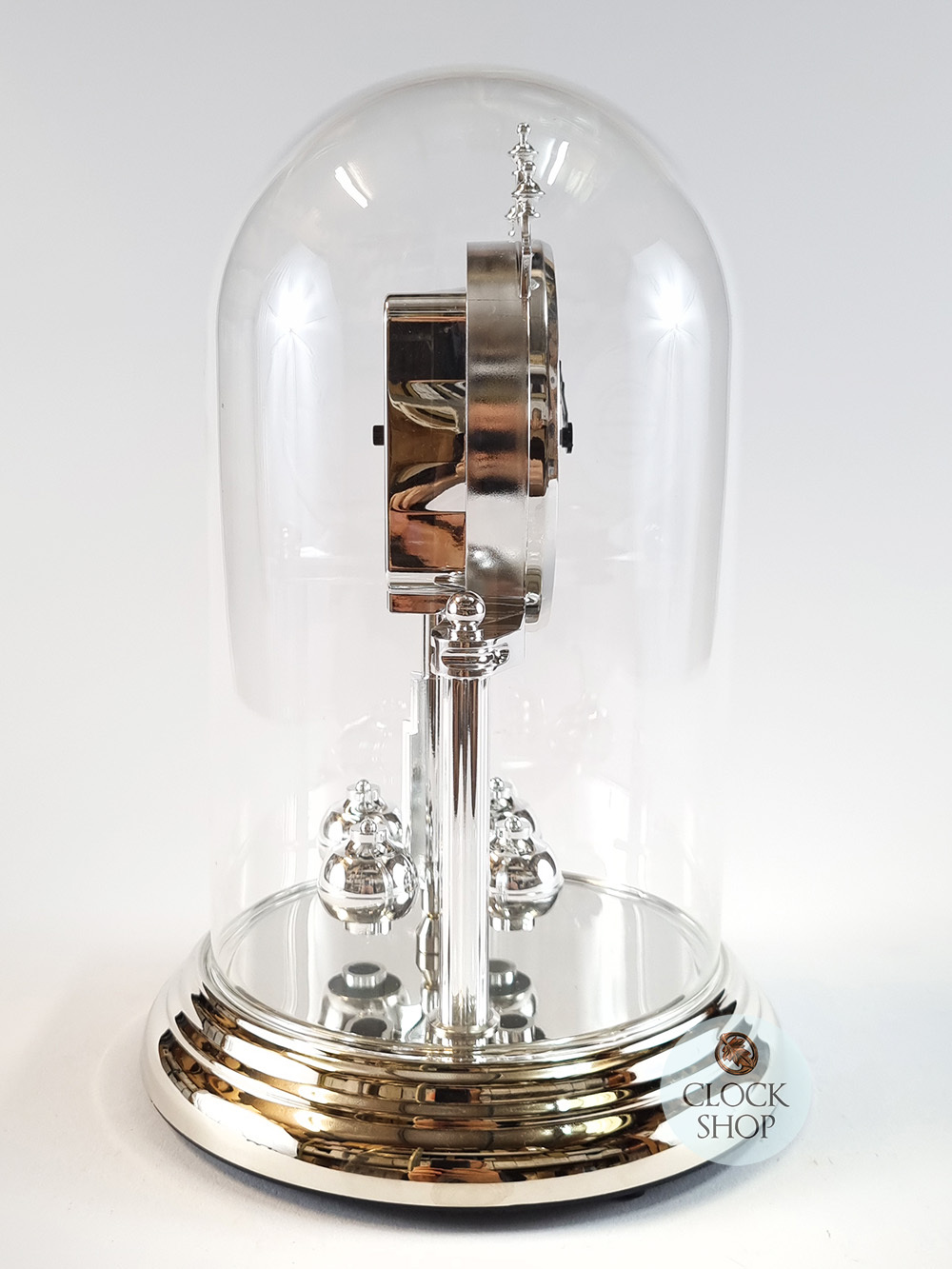 Measuring 23cm in height, this beautiful clock features a round white dial with ornate black hands and numerals. In addition, this clock features a nickel plated metal base and a spinning pendulum that twirls back and forth at the base of the clock. Rounding out this timepiece is a mineral glass dome that covers its delicate dial. This heirloom level quality anniversary clock also features a crown on top of the dial, with the overall design features in a beautiful silver design that would make an excellent gift idea for that special someone in your life.