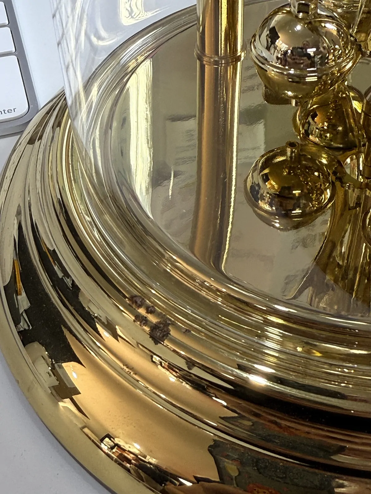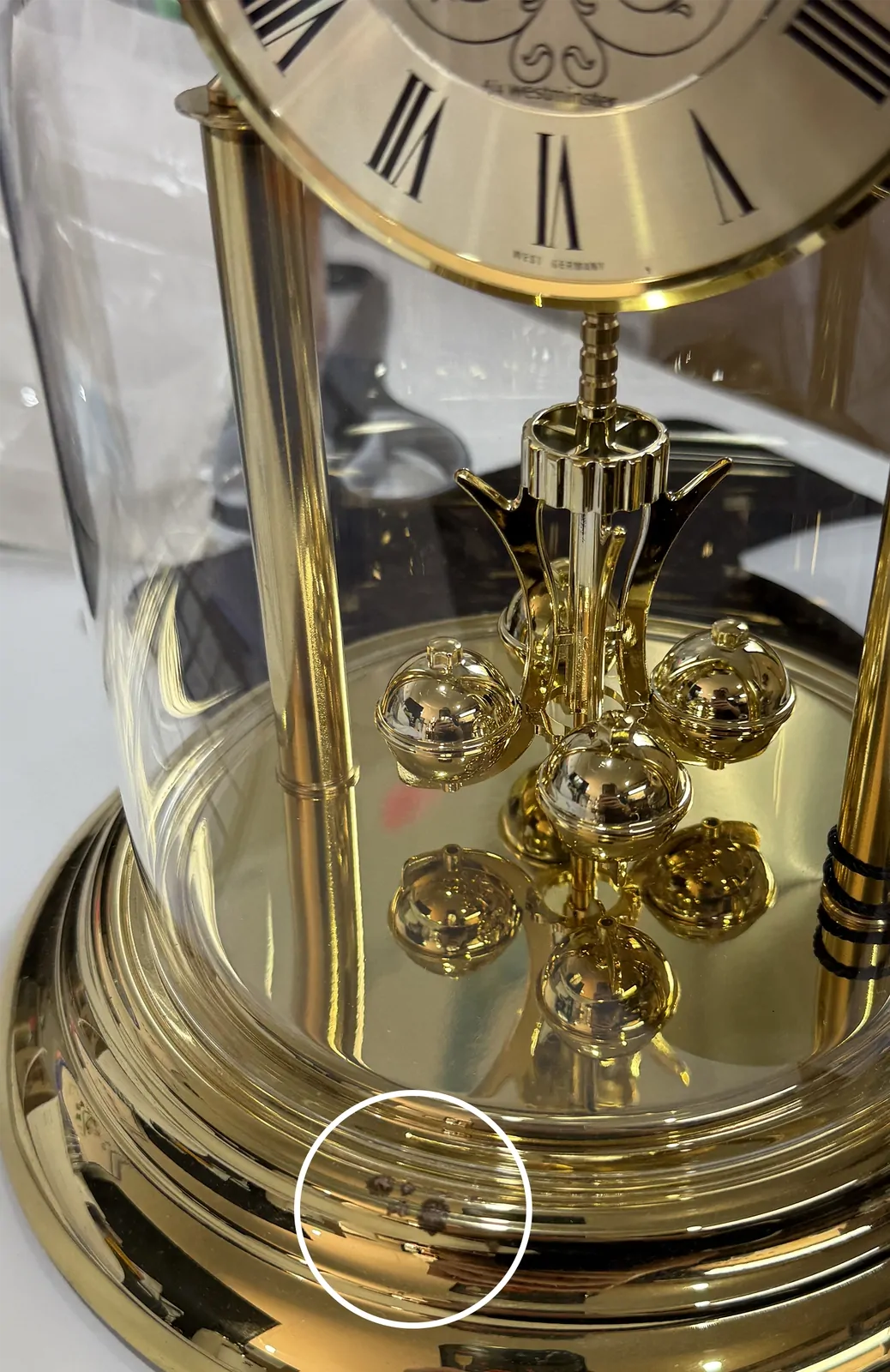 Please note, this clock is new, unused and in perfect working condition, with a small cosmetic flaw on the base plate. There is a small spot at the front of the clock (see end photos - the glass dome has been removed). This imperfection does not affect the function of the clock in any way.