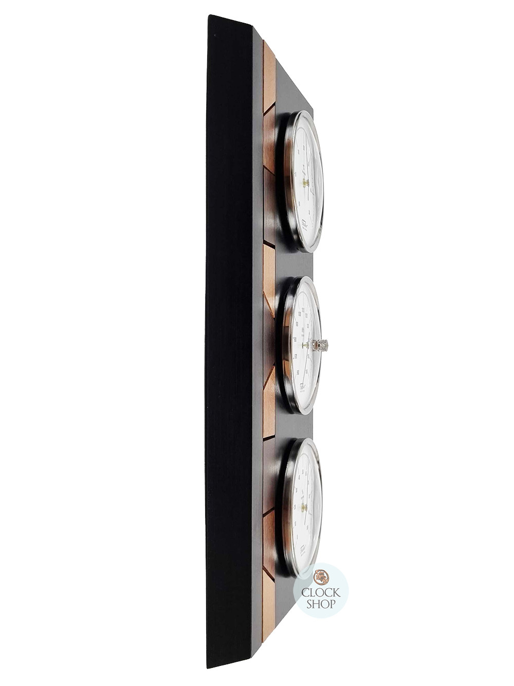 34cm Black Weather Station With Thermometer Barometer & Hygrometer With Timber Inlay By FISCHER