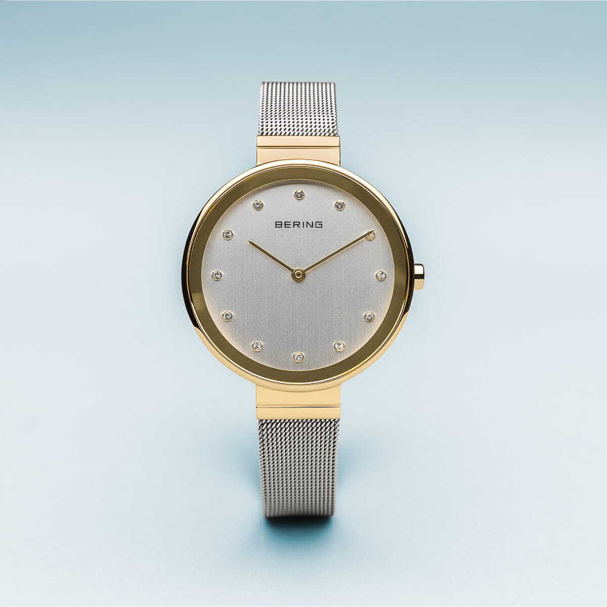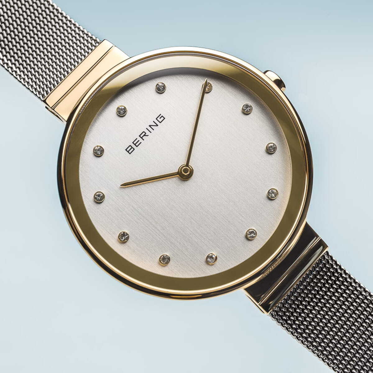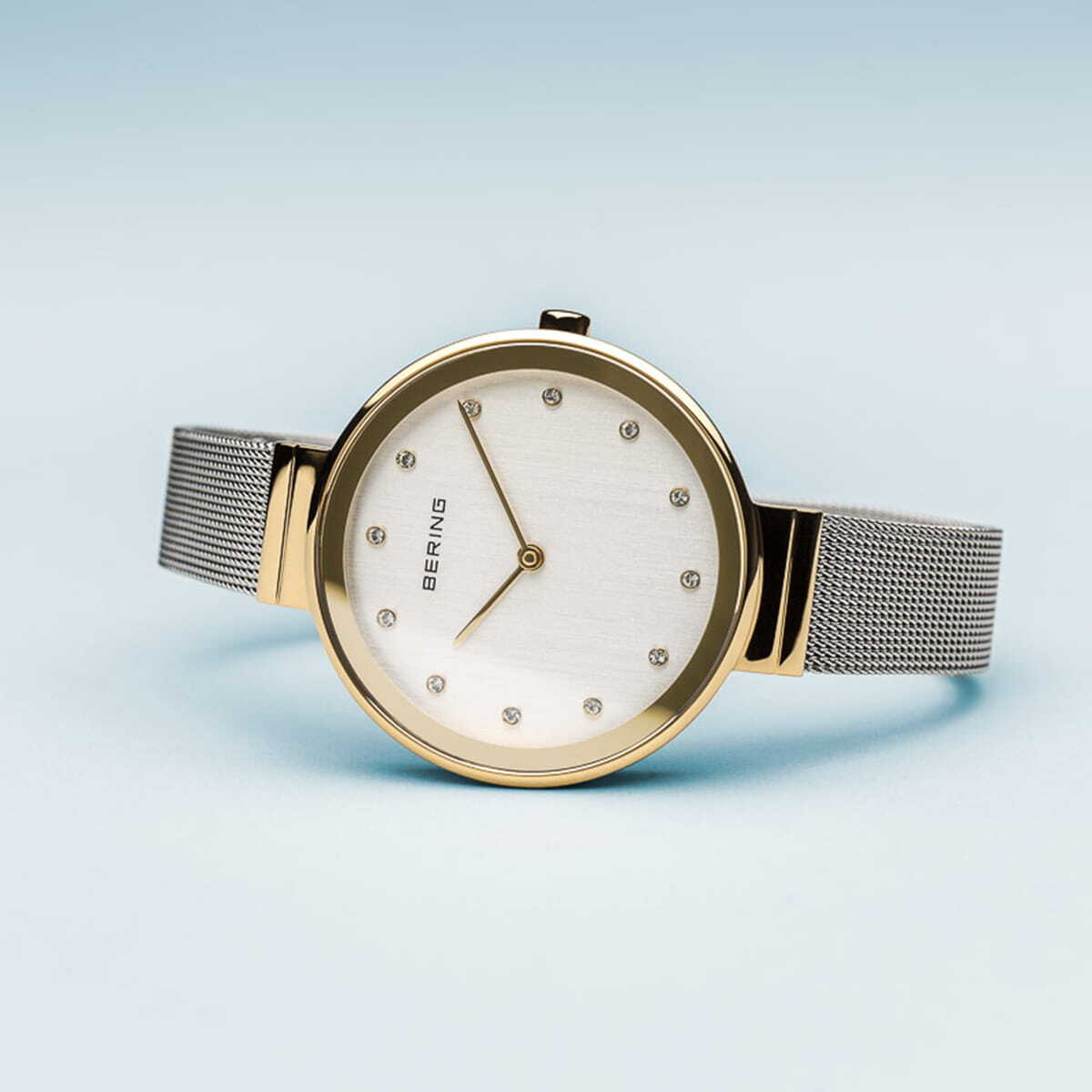This watch features a gold coloured case, made of pure, high quality, medical-grade stainless steel, in combination with the modern silver coloured milanese strap, ensuring the classic Bering look. A matching silver coloured dial is embellished with SWAROVSKI elements and protected by crystal clear, scratch-resistant sapphire crystal. The overall design completes the classic look, highlighting your daily style.