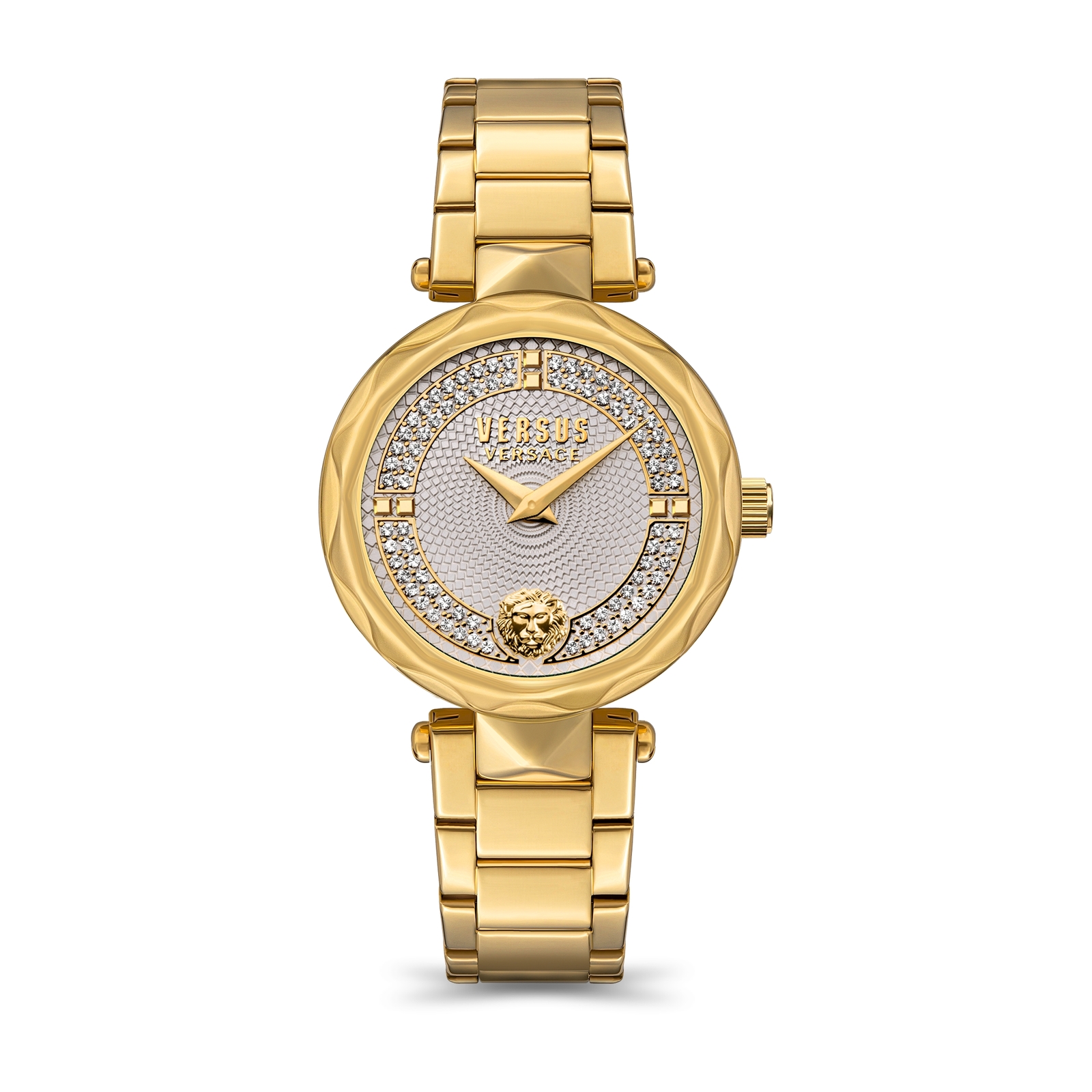 Add a touch of luxury to your wrist with the Covent Garden crystal & gold Watch by Versus Versace. This elegant watch features a case diameter of 36mm with an IP yellow gold case and bracelet. The elegant white dial is embedded with crystals, and features gold hands that add a touch of sophistication, and is protected by scratch proof mineral glass. The iconic gold Versace lions head symbol is featured on the watch dial, offering an additional classic touch to the timepiece.