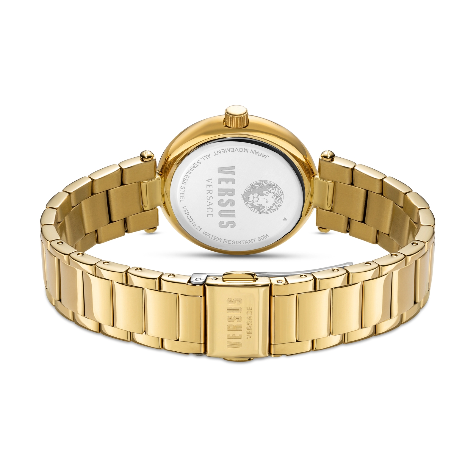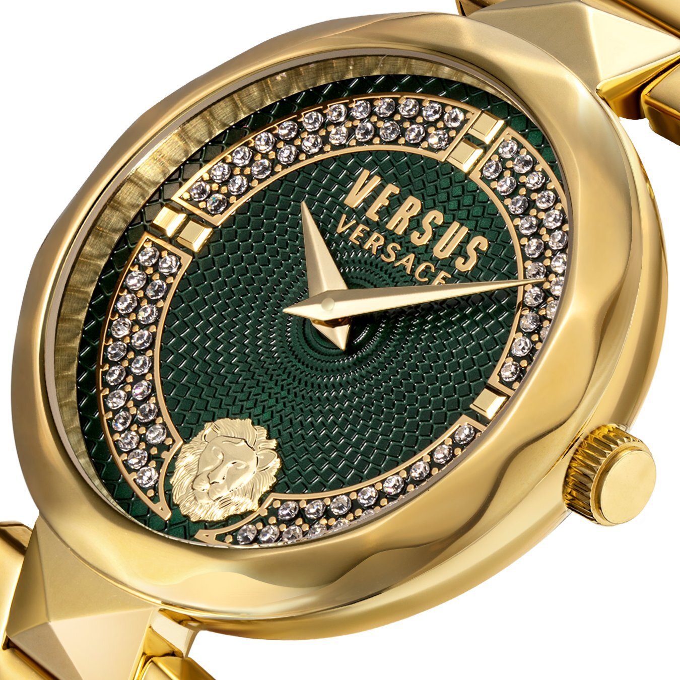 Add a touch of luxury to your wrist with the Covent Garden yellow gold Watch by Versus Versace. This elegant watch features a case diameter of 36mm with an IP yellow gold case and bracelet. The elegant green dial features gold hands and indices that add a touch of sophistication, and is protected by scratch proof mineral glass. The iconic gold Versace lions head symbol is featured on the watch dial, whilst beautiful crystals adorn the dial, offering an elegant touch to the timepiece.