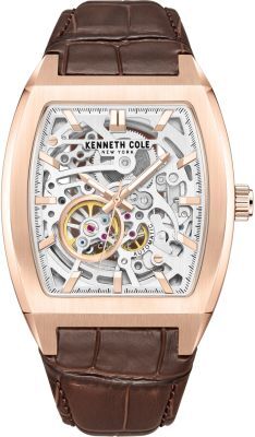 40mm Rose Gold Automatic Mens Watch With Skeleton Dial & Brown Leather Band By KENNETH COLE