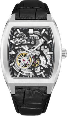 40mm Silver Automatic Mens Watch With Skeleton Dial & Black Leather Band By KENNETH COLE
