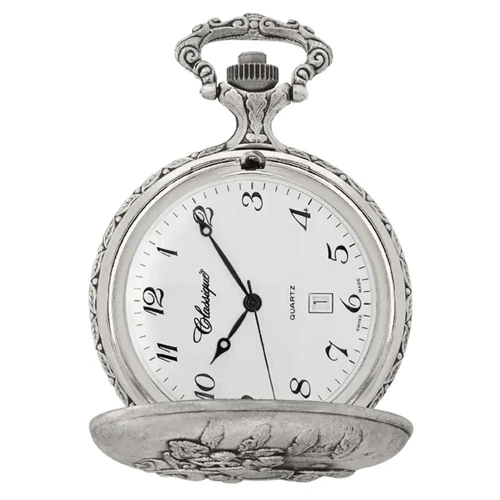 Introducing the Classique Pocket Watch - A timeless symbol of elegance and sophistication. This vintage-inspired timepiece features a 4.8cm diameter case, with Arabic numerals and elegant hour, minute and seconds hands set against a white dial. A seperate date indicator is also featured.