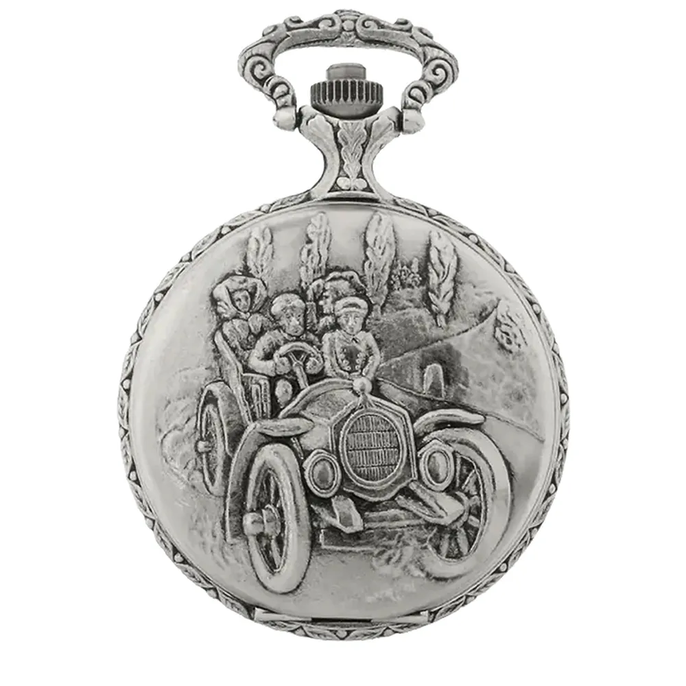 Crafted with premium materials, this pocket watch is designed to withstand the test of time, protected by a sturdy vintage rhodium-plated case with a push open lid. The Swiss quartz movement provides accurate timekeeping. The case features an engraving of a vintage Chevrolet car both front and back, along with the words 'Chevrolet'. With a complimentary Fob watch chain, it is convenient for everyday use.
