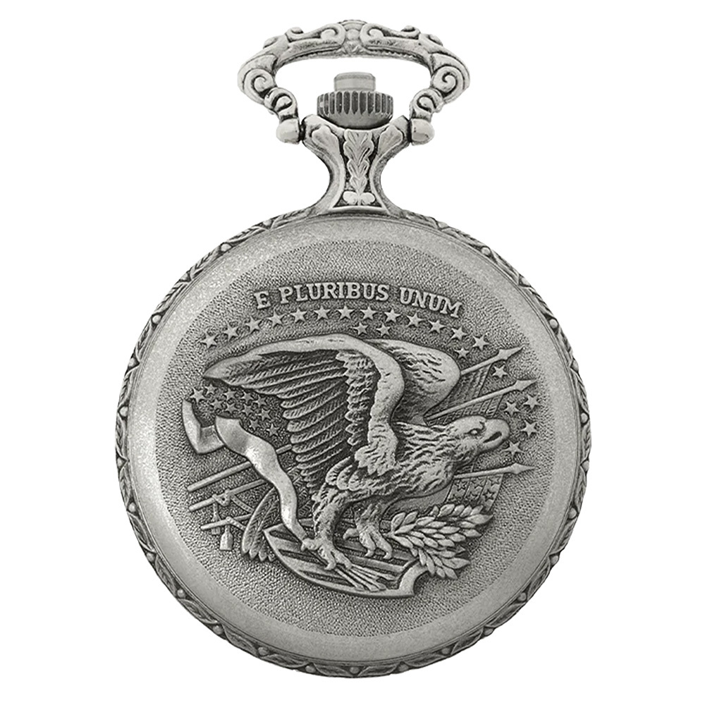Crafted with premium materials, this pocket watch is designed to withstand the test of time, protected by a sturdy vintage rhodium-plated case with a push open lid. The Swiss quartz movement provides accurate timekeeping. The case features an engraving of a couple on a motorbike on the front, and a large eagle on the back. With a complimentary Fob watch chain, it is convenient for everyday use.