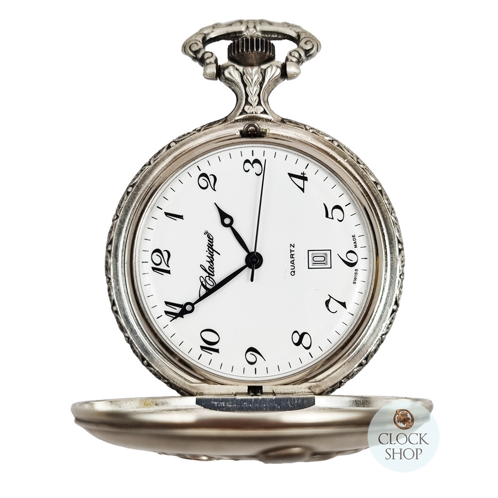 Introducing the Classique Pocket Watch - A timeless symbol of elegance and sophistication. This vintage-inspired timepiece features a 4.8cm diameter case, with Arabic numerals and elegant hour, minute and seconds hands set against a white dial. A seperate date indicator is also featured.