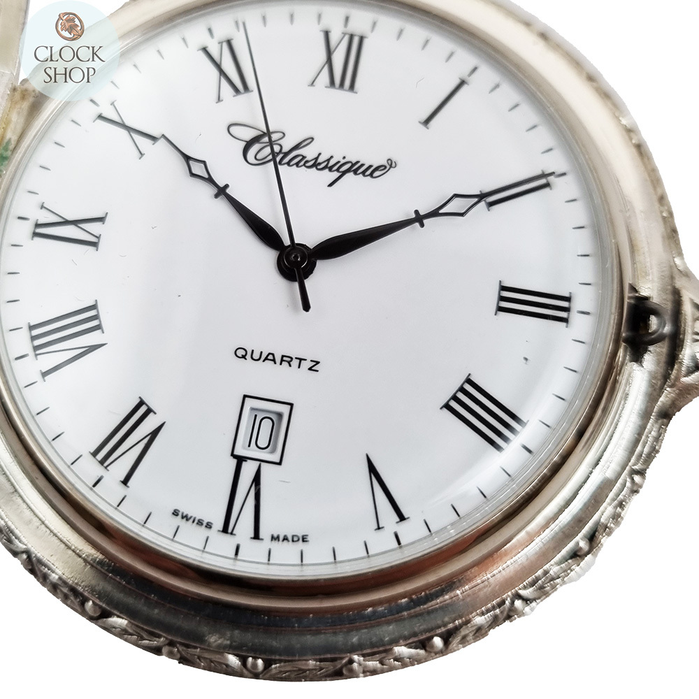 Introducing the Classique Pocket Watch - A timeless symbol of elegance and sophistication. This vintage-inspired timepiece features a 4.8cm diameter case, with Roman numerals and elegant hour, minute and seconds hands set against a white dial. A seperate date indicator is also featured.