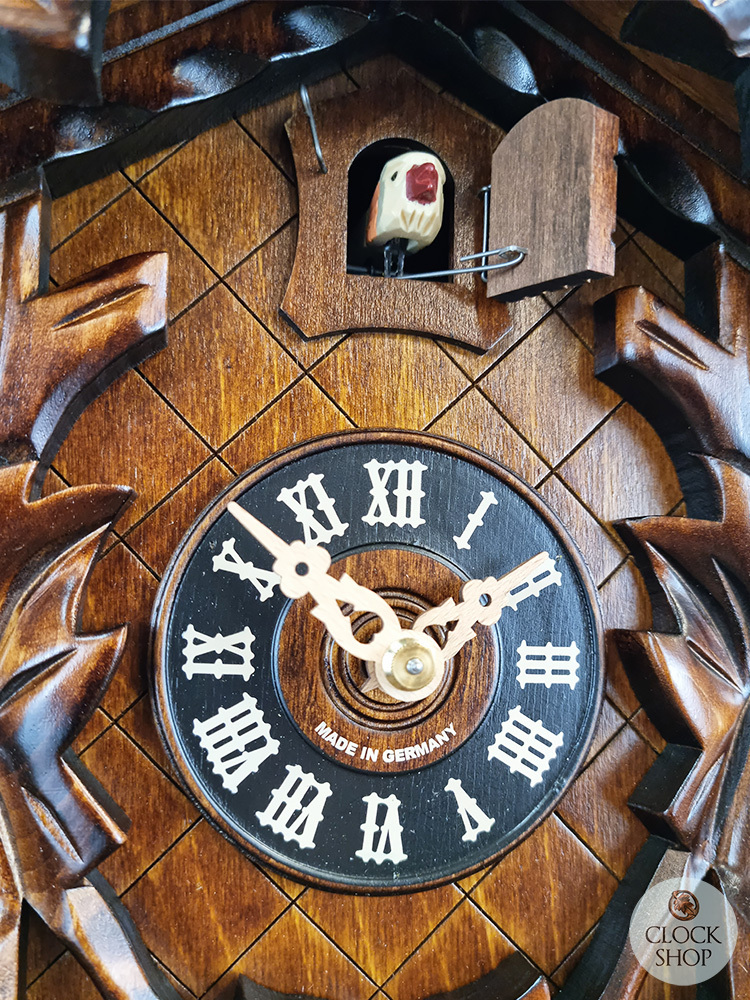 Measuring 42cm in height*, this unique clock features a hand carved large deer head at the crown of the clock along with an arrangement of 5 ornamental leaves adorning the clockβs body, a very famous and traditional element for cuckoo clock designs. The ornamental leaves around the front of the clock surround a wooden clock dial. Rounding out this timepiece is a timber pendulum that hangs below the clock, alongside the weights. The in-built cuckoo of this beautiful clock calls the time each hour and once at half past, with a manual shut-off mode that can be enabled, should that be preferred. This particular clock runs on a 1 day mechanism, and therefore needs to be wound once a day simply by pulling the weights. This clock does not play any music.