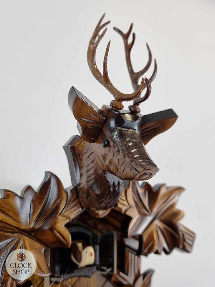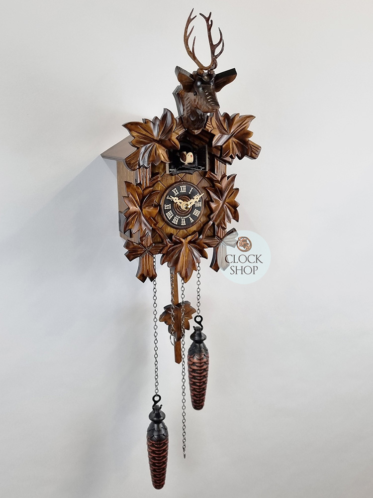 Measuring 30cm in height*, this beautiful clock features a deer carving at the crown of the clock along with an arrangement of 5 ornamental leaves adorning the clockβs body, a design which represents a very famous and traditional element for cuckoo clock designs, making up one of the most popular styles of cuckoo clock carvings today. The design of a frame of leaves is often crowned with a carved bird, however this particular clock instead features a deer. A wooden clock dial is featured in the middle of the timepiece, with easy to read roman numerals. The clock also features a timber pendulum that hangs below the clock, alongside the decorative display weights.