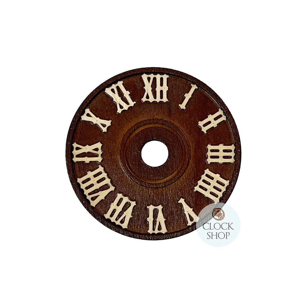 This replacement wooden cuckoo clock dial features Roman numerals and measures 50mm in diameter.