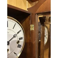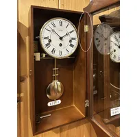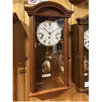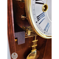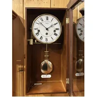 Measuring 53cm in height, this beautiful wall clock features an elegant white round dial with neat black roman numerals and black hands that instantly draws the eye. Rounding out the body of this fascinating clock is a traditional walnut stained timber case, and a decorative glass door. The clock features a neat polished brass pendulum that compliments the overall design perfectly.