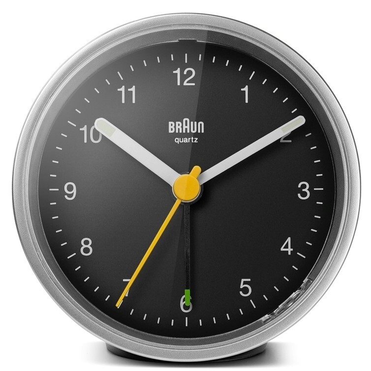 Measuring 7.5cm in height, this beautiful alarm clock features a round silver case surrounding a black dial with white numerals. It features large white hands that have luminous tips on them to allow for night visibility, along with an iconic yellow seconds hand that quietly ticks around the dial- a feature that is synonymous with Brauns award winning design.