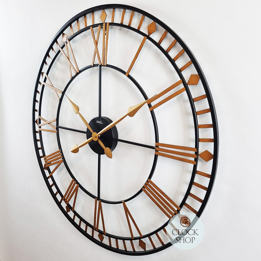 Measuring an impressive 80cm in diameter, this clock features a weathered-look metal body that also acts as the dial, with the clockβs gold roman numerals cut into the body, accentuated by the gold hands.