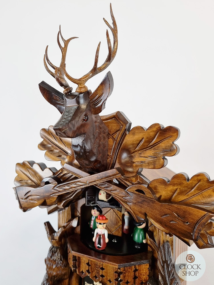 Measuring 42cm in height*, this beautifully hand-carved clock features a stag head carving crowning a traditional hunting scene. Hunting scenes often feature a hare and a pheasant and 2 rifles hanging from the head of the clock. Additional details to complete the hunting scene includes a powder bag at the base of the clock as well as a horn that surrounded the dial. Beautiful oak foliage also adorns the clock, rounding out this fantastic hunting scene which also includes colourful dancers situated on a balcony above the clock dial. Decorative display weights hang below the clock dial.
