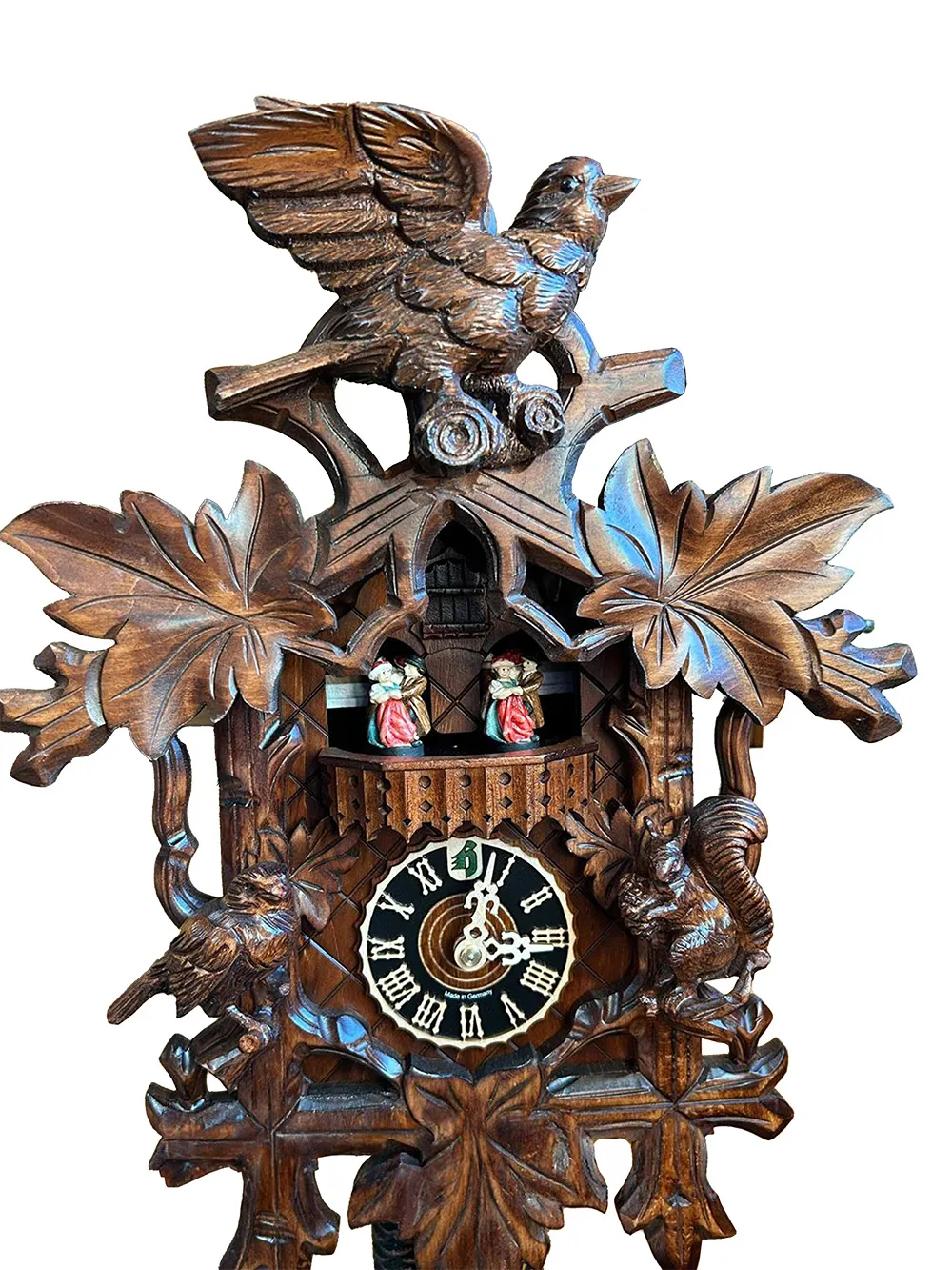 This unique clock features a full bird carving at the crown of the clock along with an arrangement of ornamental leaves adorning the clock’s body, a very famous and traditional element for cuckoo clock designs. The ornamental leaves around the front of the clock surround a wooden clock dial, with a bird and a squirrel positioned next the clock dial, one on either side. Rounding out this timepiece is a timber pendulum that hangs below the clock, alongside the weights, and colourful dancers on a balcony above the clock dial. Perhaps the most unique feature of this fascinating clock is the deep and detailed carvings with high attention to detail - ensuring this timepiece truly stands out from the rest.