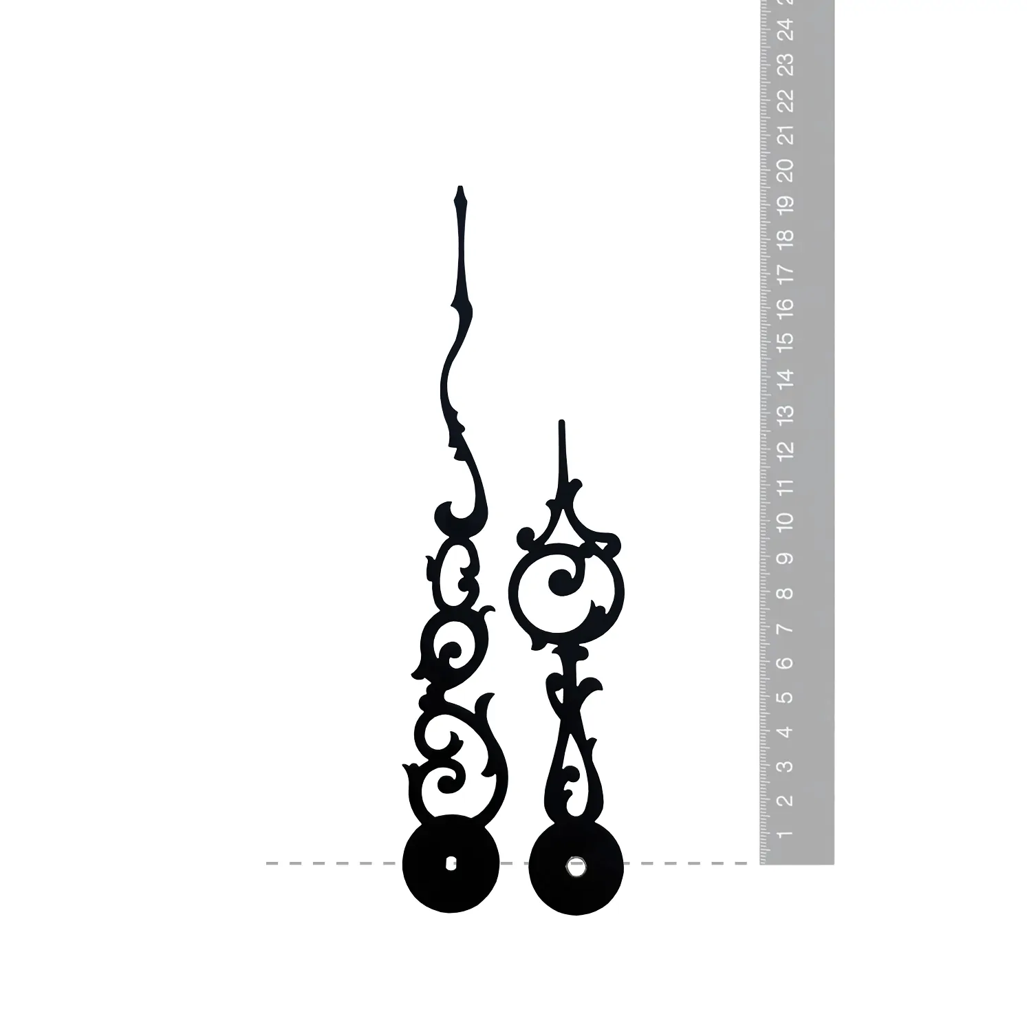 These hands feature a serpentine design, with a minute hand length of 195mm and an hour hand length of 130mm. The hand length is measured from the centre hole to the very end of the hand, not from end to end. These hands are designed for use with larger clocks that require a Euroshaft high torque movement.