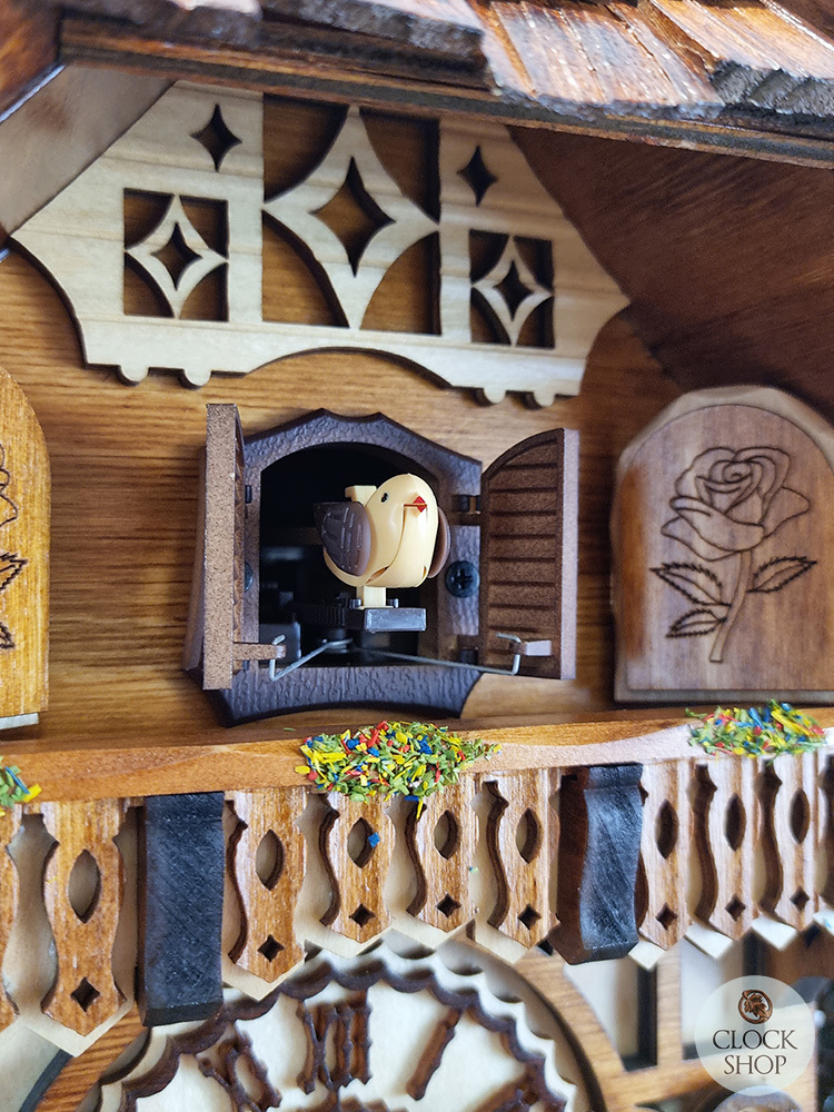 This cuckoo clock comes with an option of 12 different melodies that rotate each hour. The music can be turned off via a switch if preferred.