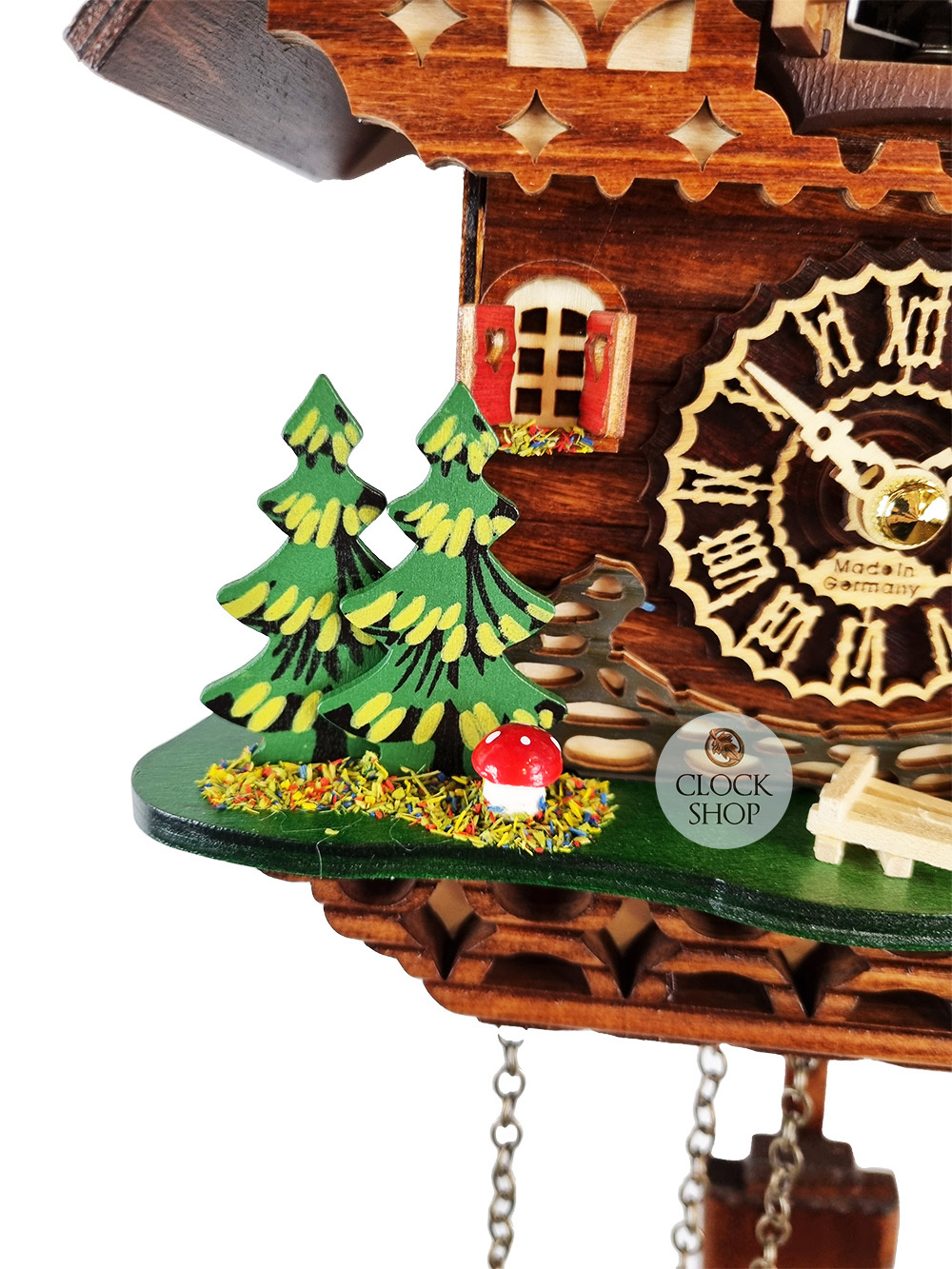 Measuring 22cm in height*, this beautiful clock portrays a delightful scene in the bavarian countryside, featuring a timber style chalet house with a unique facade. Out the front of the chalet is a water trough, a dog and some pine trees. This fascinating scene also includes a wooden clock dial in the centre of the chalet, and hand painted details including red window shutters and flowers in the windowsill. Rounding out this unique clock is a timber pendulum that hangs below the clock itself, along with the decorative display weights. One thing is for sure, this quaint cuckoo clock is sure to spark some joy to all.