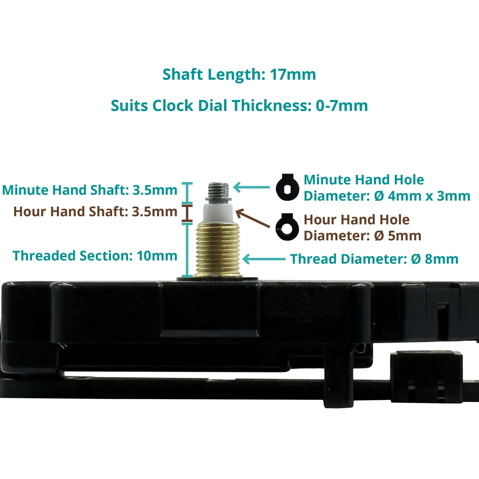 The movement has a total shaft length of 17mm and is compatible with pendulum clocks that have a dial thickness between 0-7mm. The thread diameter is 8mm.