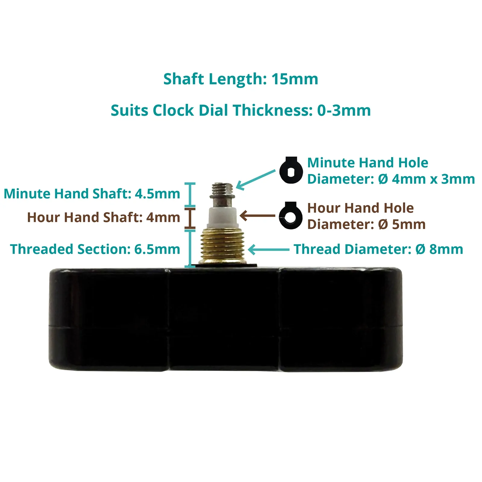 The movement has a total shaft length of 15mm and is compatible with clocks that have a dial thickness between 0-3mm.