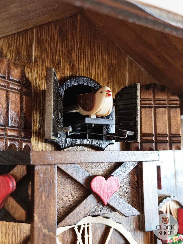 The in-built cuckoo of this beautiful clock calls the time each hour, with an automatic night-time shut-off that is controlled by a light sensor. When the room is dark enough, the cuckoo will no longer sound allowing you a sound sleep, before recommencing as the room lights up again the next morning. There is also a manual override to silence the cuckoo altogether should that be preferred. This particular chalet cuckoo clock also features music with 12 different traditional melodies, however this function can also be turned off.