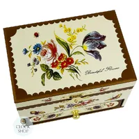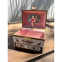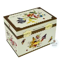 Elegant and sweet, this floral musical jewellery box features beautiful printed floral artwork on each side of the box, as well as a ballerina who twirls to the music when the box opens. This delightful piece offers seperate compartments to store your most precious jewellery and keepsakes including a seperate drawer & a small mirror. Introduce your little ones to music from a young age with this music box that plays a melody from Romeo & Juliet.