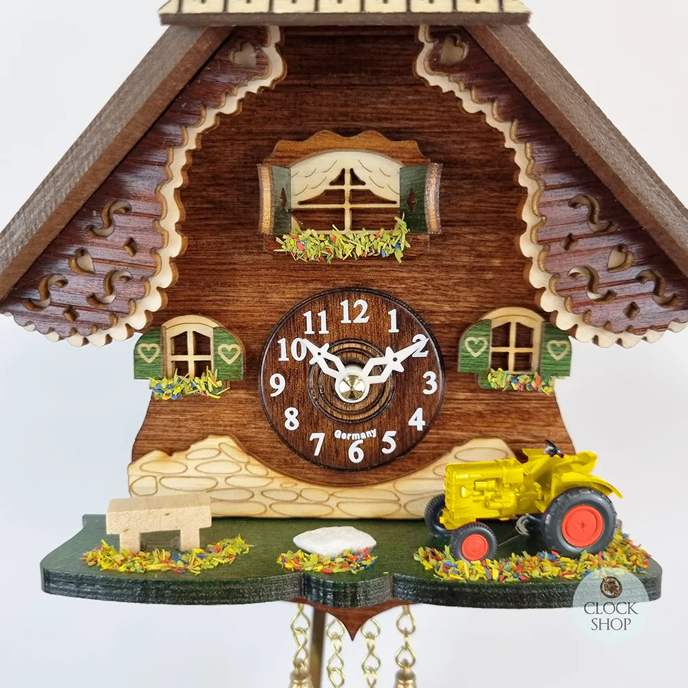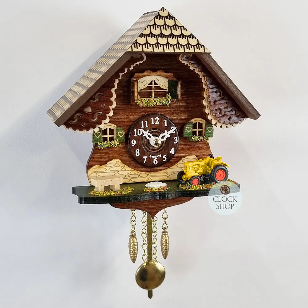 Measuring 16cm in height*, this beautiful clock features a forest chalet clock design, a common clock design shaped as alpine houses, featuring details that represent life in the mountain regions of Europe (around southern Germany, Switzerland and Austria). This particular clock features a wooden chalet with a timber facade, with a tractor and a bench seat out the front of the chalet. Additional features include hand painted window shutters and flowers in the windowsills. A wooden clock dial is featured in the centre of the timber chalet, whilst a polished brass pendulum hangs below the clock alongside decorative display weights. This timepiece is powered by a high quality quartz movement that is accurate at keeping time. It is recommended to change the batteries annually to ensure longevity of your clock mechanism.
