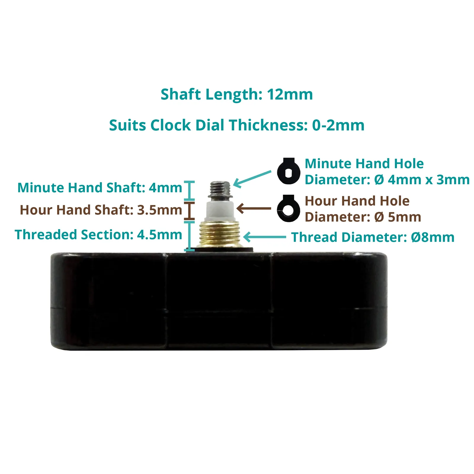 The movement has a total shaft length of 12mm and is compatible with clocks that have a dial thickness between 0-2mm.