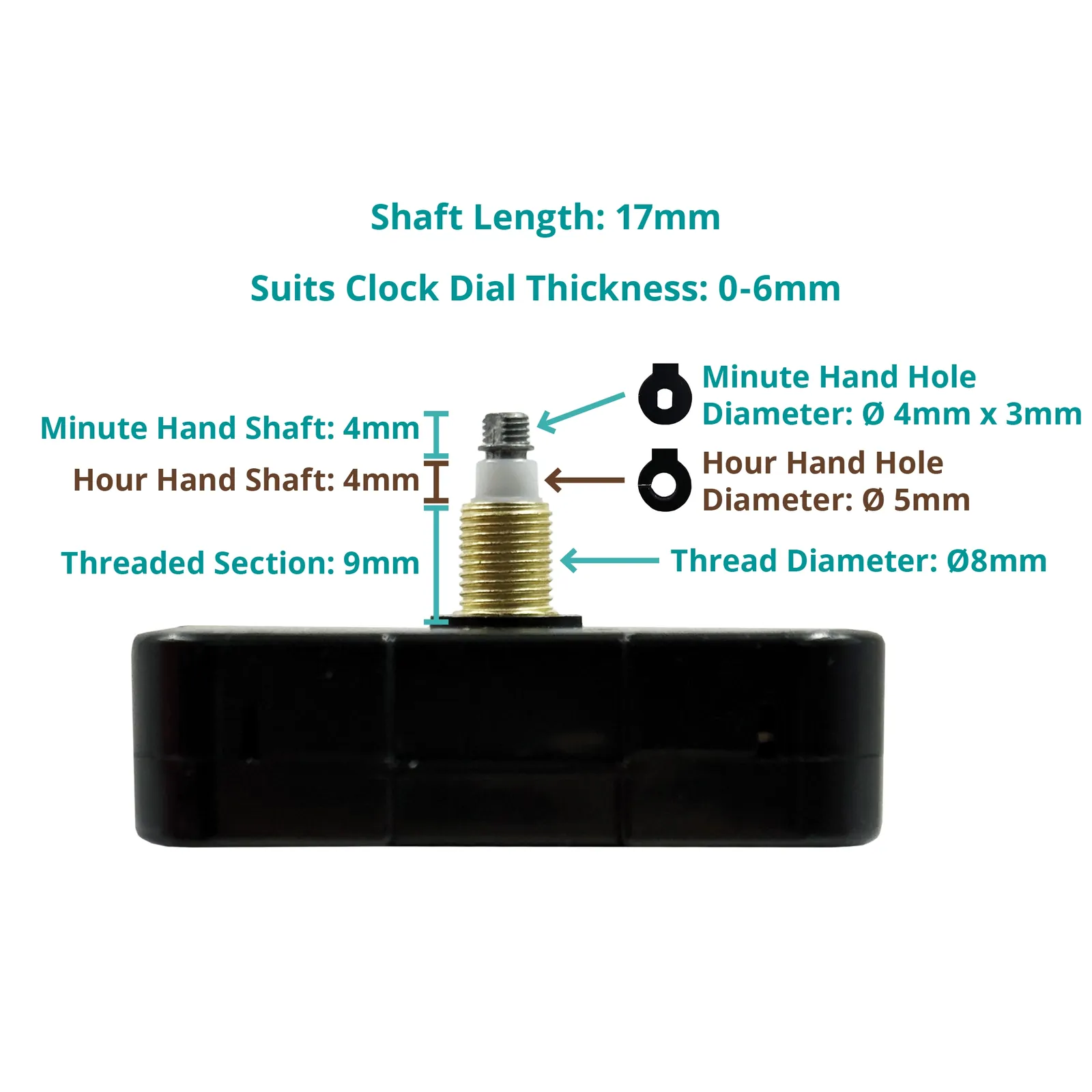 The movement has a total shaft length of 17mm and is compatible with clocks that have a dial thickness between 0-6mm.