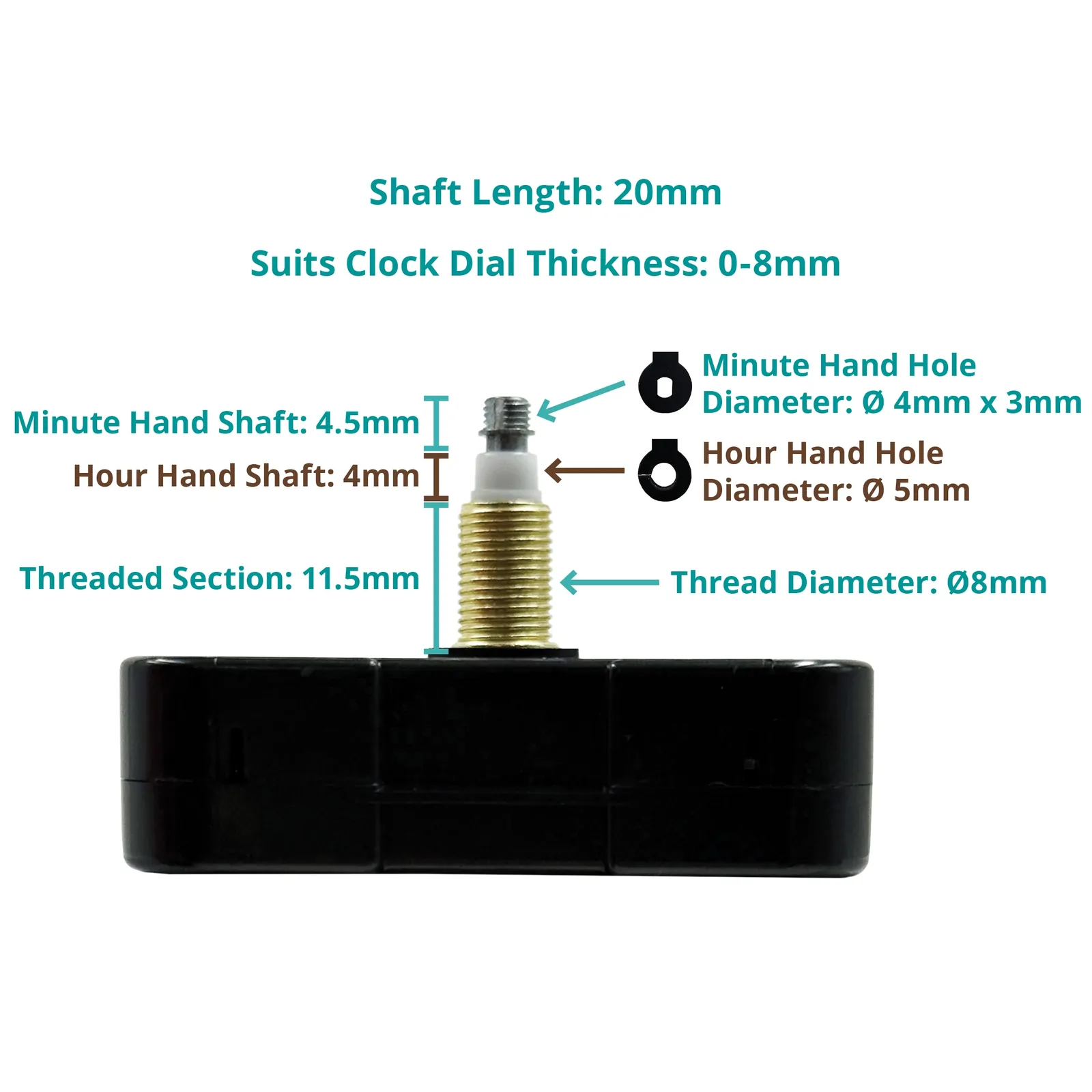 The movement has a total shaft length of 20mm and is compatible with clocks that have a dial thickness between 0-8mm.