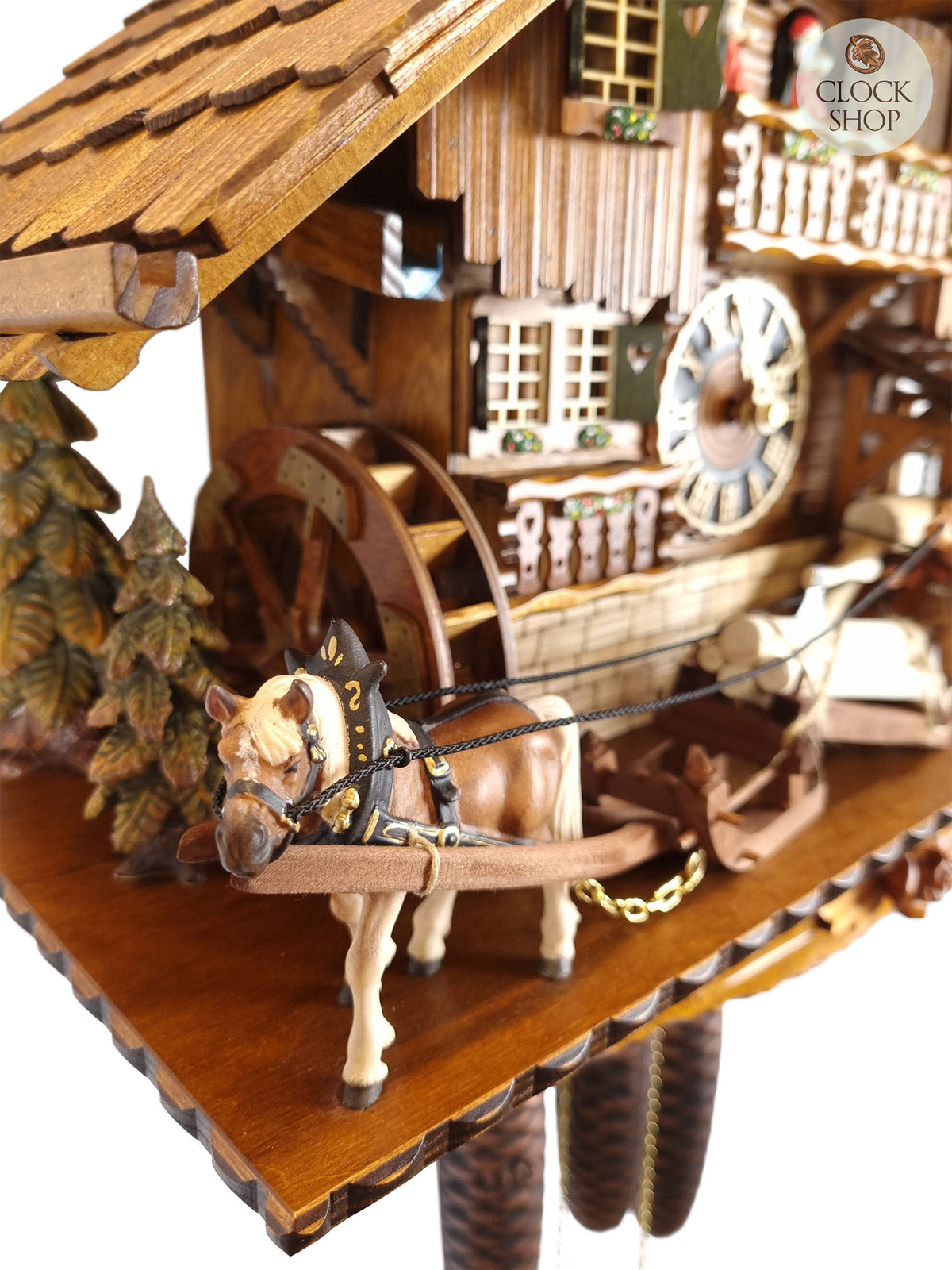Measuring 58cm in height*, this cuckoo clock portrays a delightful saw mill scene in the Bavarian countryside, featuring a multi level chalet house with a timbered facade and a shingled roof, that has been crafted with individual hand laid wooden shingles. Chalet style cuckoo clocks are the most famous and common type of cuckoo clock, and are often featured in the shape of alpine houses. They usually feature carvings that represent life in the mountain regions of Europe (mainly around Southern Germany, The Black Forest, Switzerland and Austria). Out the front of the chalet features a work horse pulling freshly chopped logs, assisted by a logger. Additional details out the front of the chalet include some carved trees, and a water wheel.