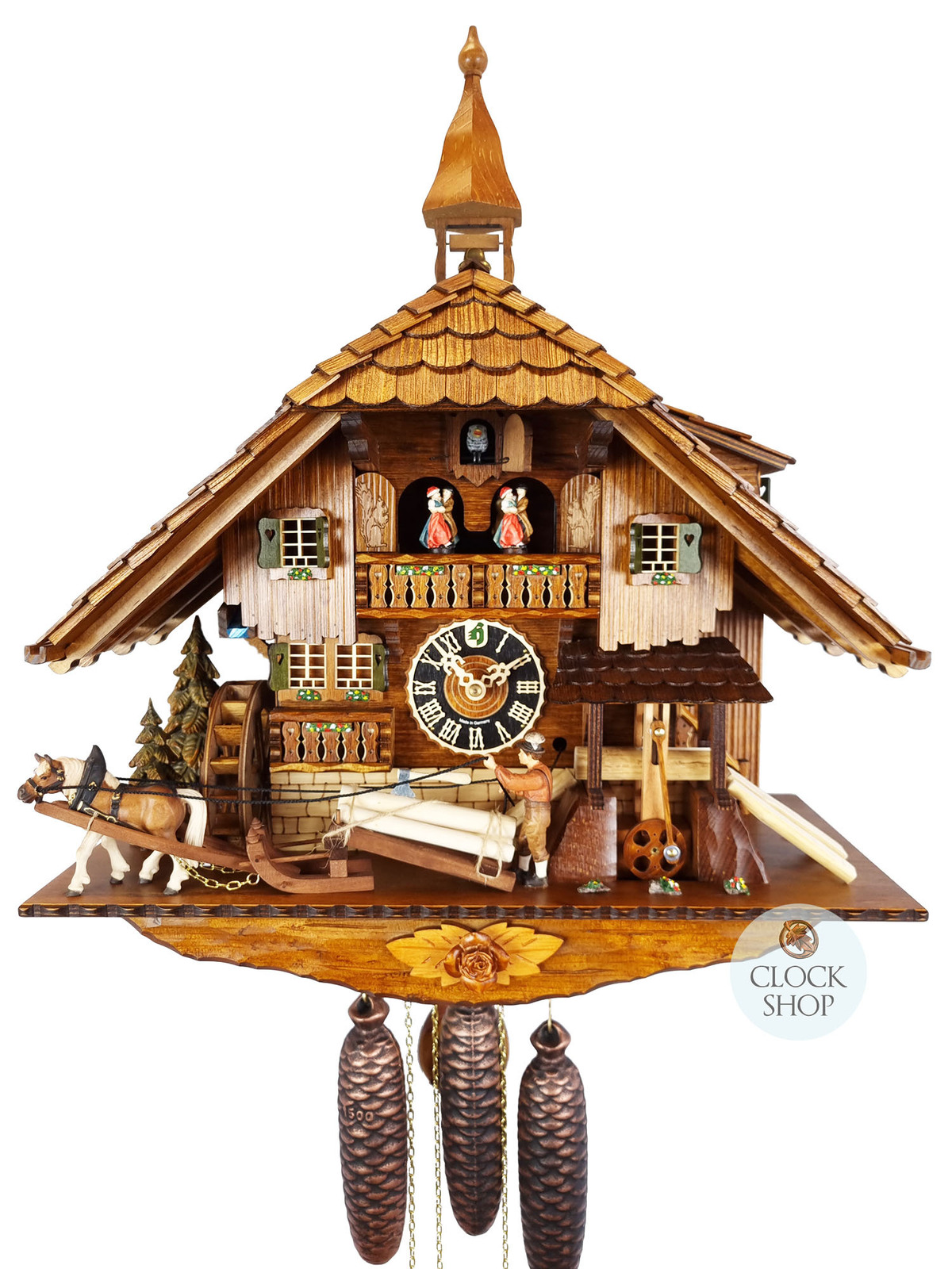 The in-built cuckoo of this clock calls the time each hour and once at half past through a door that opens. There are two melodies that alternate with this clock after the cuckoo calls on the full hour - Edelweiss and Happy Wanderer. This particular clock is an 8 day mechanism, and therefore needs to be wound once a week. The particular automaton (moving parts) for this clock include the logger, the water wheel, the saw mill and the dancers on the balcony who twirl when the music plays on the full hour. It also comes with a night shut off mode.