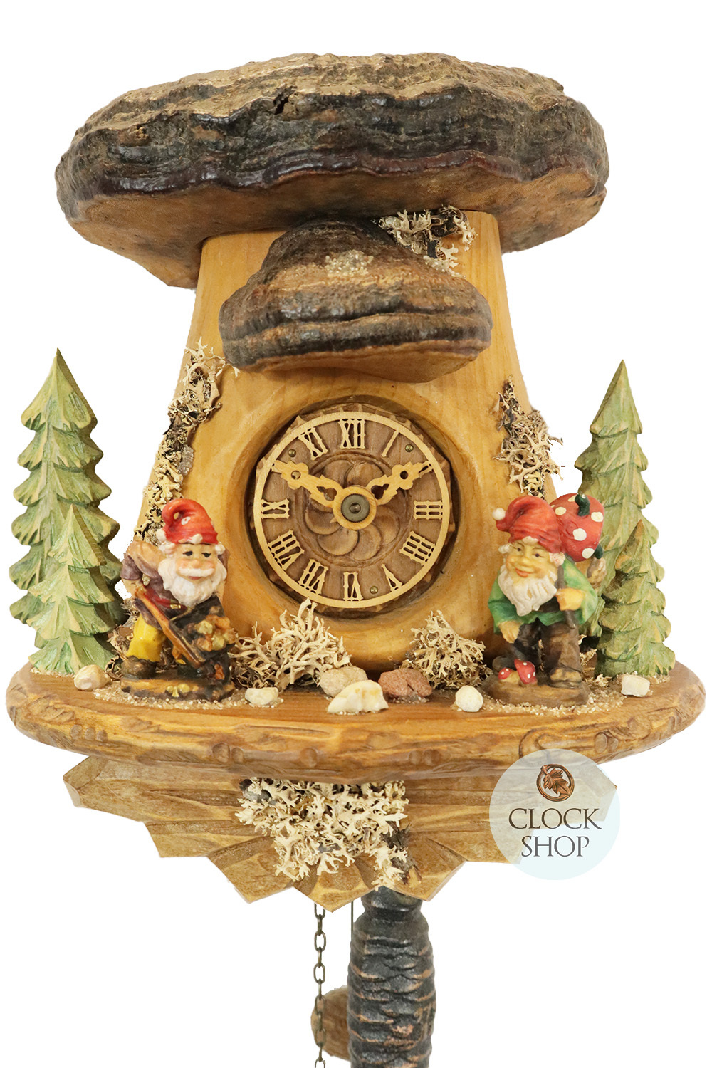 Measuring 22cm in height*, this exquisite limited edition hand-carved clock provides a truly unique take on a clock design, representing a mini dwarf house with 2 colourful dwarves out the front of the house busy at work. Perhaps the most unique aspect of this clock is the addition of a real forest mushroom that has been collected from the Black Forest, glazed and set as the roof of the house. Additional features include a beautiful wooden dial in the centre of the house which draws the eye, along with beautiful ornamental pieces out the front of the house that help to set the scene perfectly.