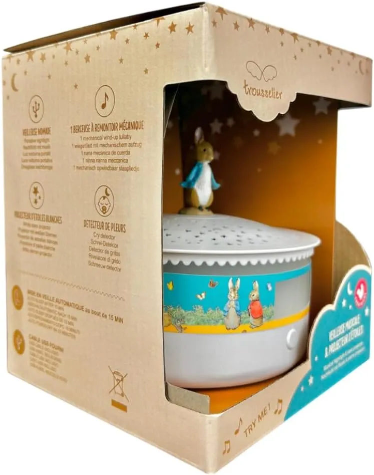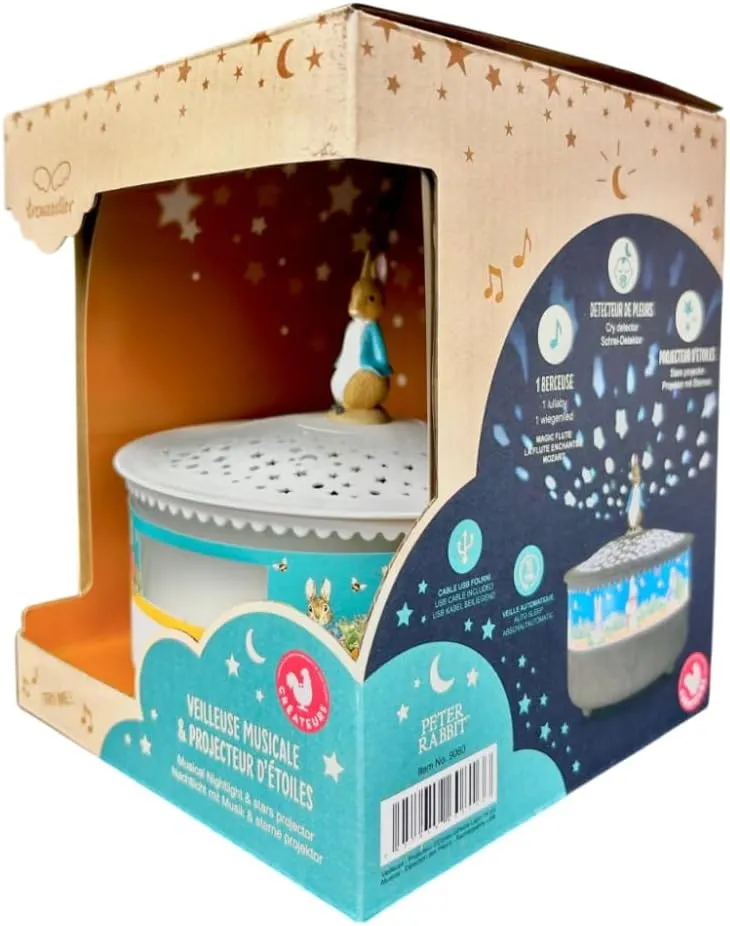 This Peter Rabbit themed music box doubles as a star projector and night light, and features a Peter Rabbit figurine who twirls when the music is activated. Once activated, the Peter Rabbit figurine spins to the tune of The Magic Flute by Mozart whilst the star projector projects white stars onto the ceiling. When the manual winder is used, the stars will illuminate for a duration of 2 minutes 30 seconds. This creates the illusion of a starry night for any young childs bedroom, which will accompany any young child to the land of dreams. This product will detect your child's crying and automatically turn on to soothe them again. To preserve battery life, the night light automatically turns off after 15 minutes and reactivates in case of noise if the cry detector function is activated. USB cable included.