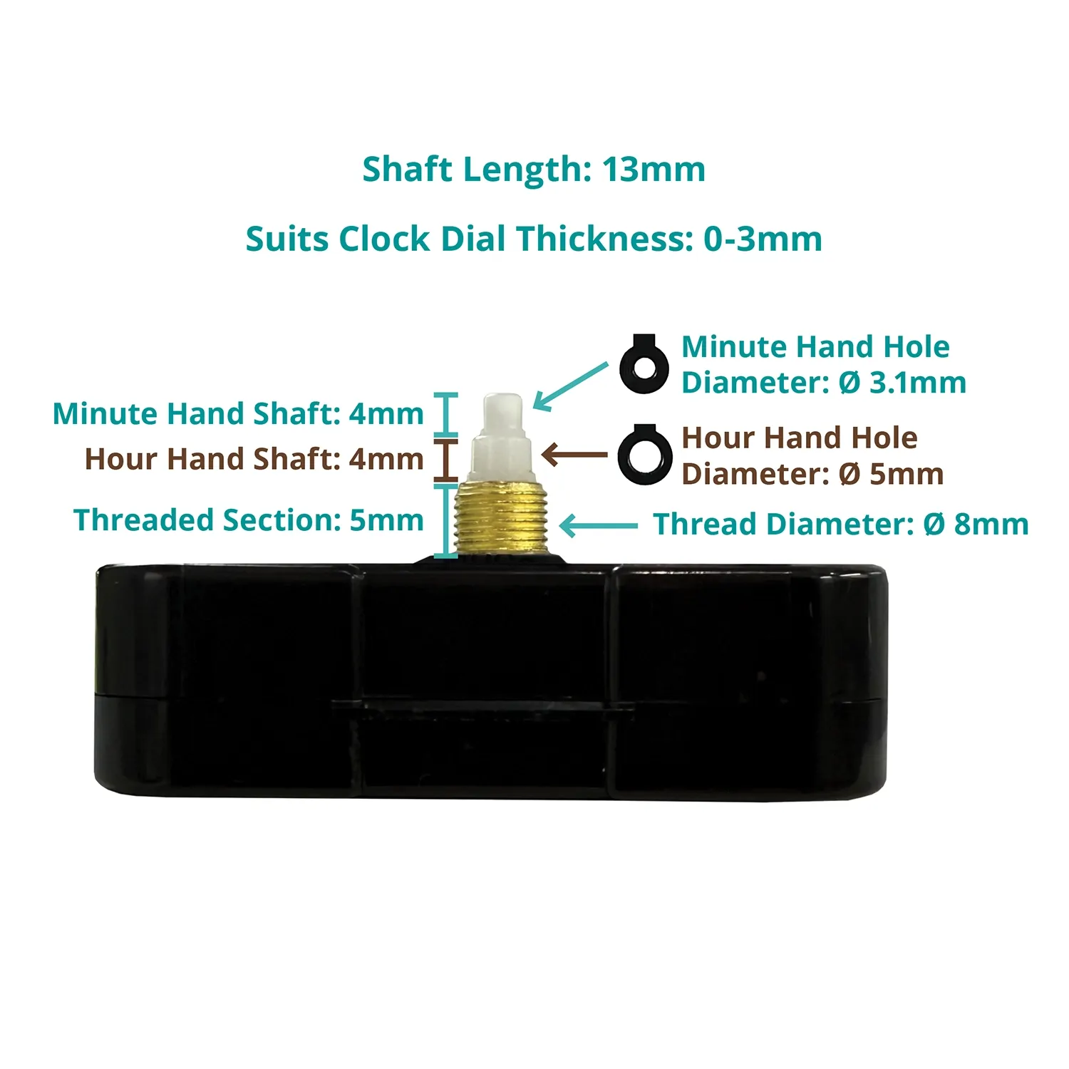 Press Fit Step Clock Movement | 13mm Shaft | Threaded | Fits 3.1mm & 5.0mm Hand Holes