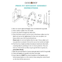 The main difference between a standard press fit movement and a German press fit movement comes from the hand hole dimensions which have slightly different measurements. It is important to measure your existing hand hole dimensions prior to purchasing, to ensure you find the correct replacement. In addition, the finished appearance between the two movements differs slightly- a German press fit movement uses a collar to secure the movement to a clock (which requires a slightly larger dial hole and thickness), whilst a standard press fit movement instead uses a hex nut and a brass thread. Please be sure to check the diameter of your dial hole and hand hole dimensions prior to purchasing to ensure you select the most suitable movement.