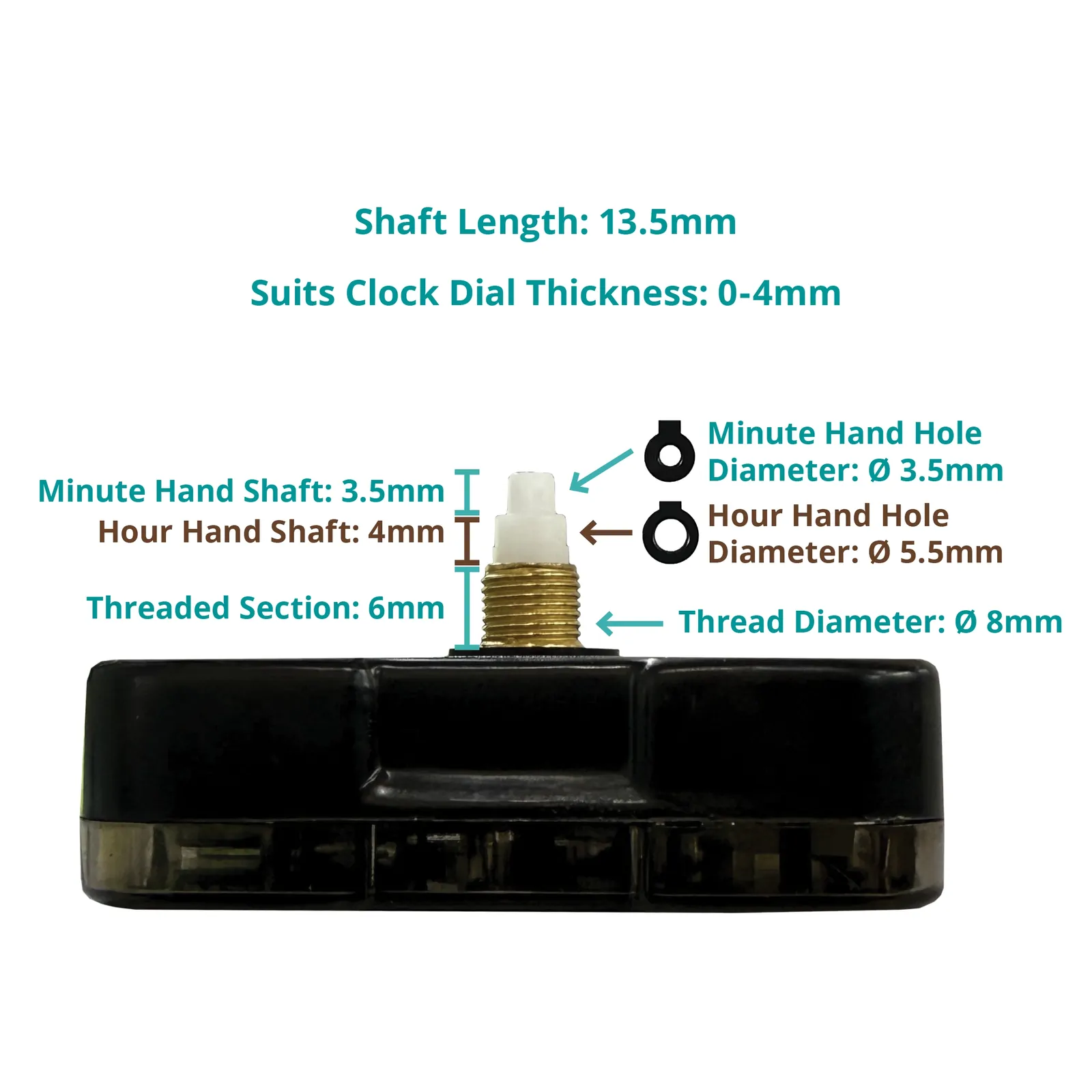 The press fit movement in this kit has a total shaft length of 13.5mm, and is compatible with clocks that have a dial thickness between 0-4mm. The hands included in this kit will easily press onto the shaft, and the seconds hand will sweep continuously around the dial.