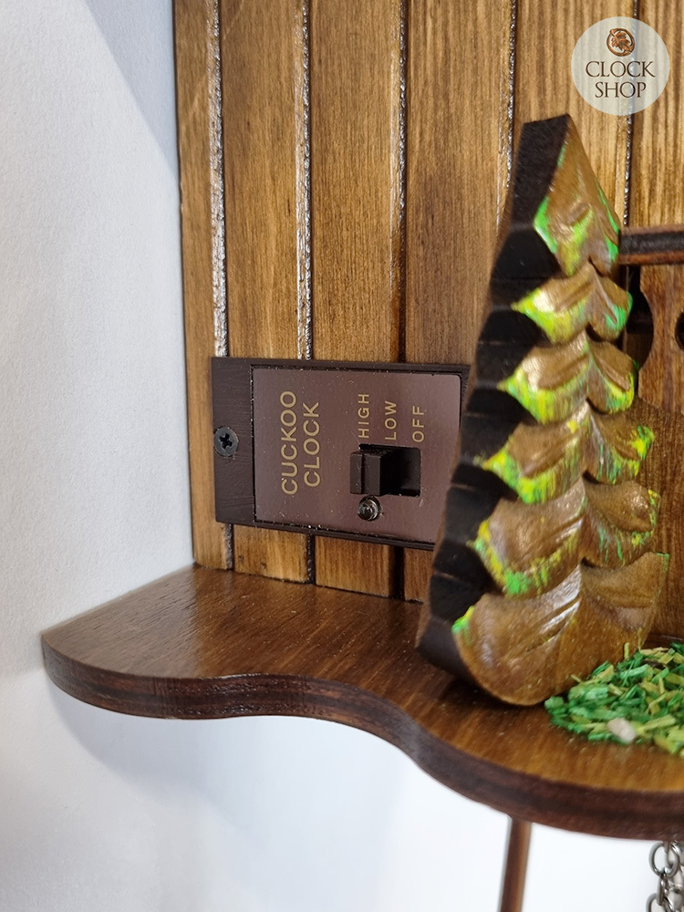 Chalet cuckoo clocks are the most famous and common type of cuckoo clocks and are often shaped as alpine houses, featuring carvings representing life in the mountain regions of Europe (around southern Germany, Switzerland and Austria). The in-built cuckoo of this beautiful clock calls the time each hour, with an automatic night-time shut-off that is controlled by a light sensor. When the room is dark enough, the cuckoo will no longer sound allowing you a sound sleep, before recommencing as the room lights up again the next morning. There is also a manual override to silence the cuckoo altogether should that be preferred. This cuckoo clock does not come with any moving features or music. Decorative display weights hang below the clock itself.