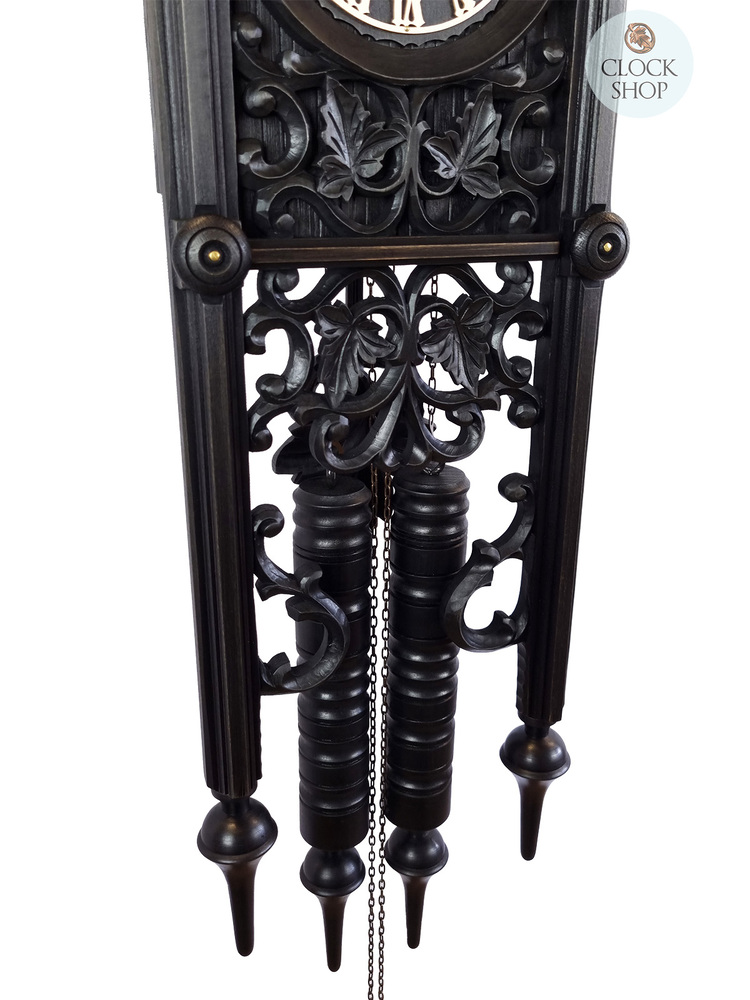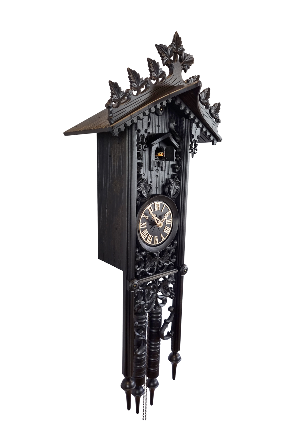 Measuring 101cm in height, this impressive clock features the design of a railroad house, or, BahnhΓ€usleuhr in German, which resembles an important milestone in the history of Black Forest Clock Making. The design came to be in the mid 18th century, by Friedrich Eisenlohr, an architect for a railroad company, who was inspired by the houses of railroad gatekeepers. This vintage reproduction is a bold design, and features deep and detailed carvings - features which set Robert Herr cuckoo clocks apart. Additional details to complete the overall design feature include the clock dial, numerals and hands which are also made from wood, whilst the chains and other visible metal parts are darkly burnished. The clock has been treated with a black antique wax, and the weights are encased in beautiful hand turned wooden housings.
