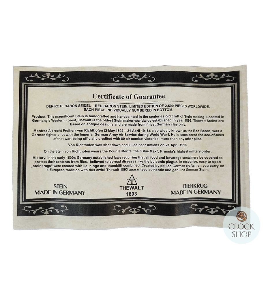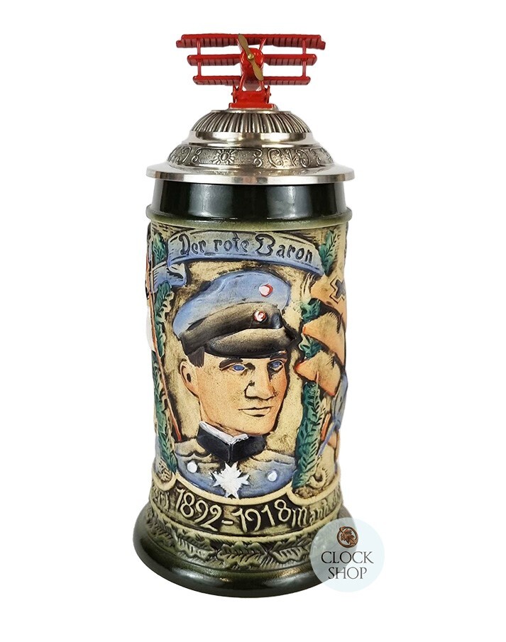 The Red Baron was the name given to Manfred von Richthofen, a German fighter pilot who flew an original Fokker Dr1 Dreidecker fighter plane during WW1 fighter, which he painted red. Manfred became renowned for his impressive flying skills, and was considered the deadliest pilot in the entire war. For this reason he was both feared and respected by his enemies until he was shot down in 1918. On this stein, Manfred wears the Pour le Merite, the "Blue Max", which was Prussias highest military order.