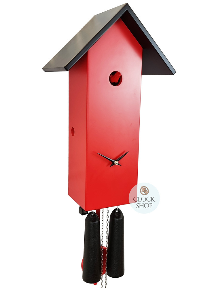 Modern, original and artistic are three terms that easily come to mind when considering this trendy cuckoo clock. Measuring 41cm* in height, this bold clock is made from solid wood and is shaped in the style of a chalet style bird house that has been painted red, with a black roof, which provides an eye catching timepiece on the wall. The clock also features easy to read black hands - do note there are no numbers on this clock, nor is there a cuckoo door for the bird. Rounding out the modern aesthetic of this timepiece is a small pendulum that is also red in colour, that hangs alongside small black weights.